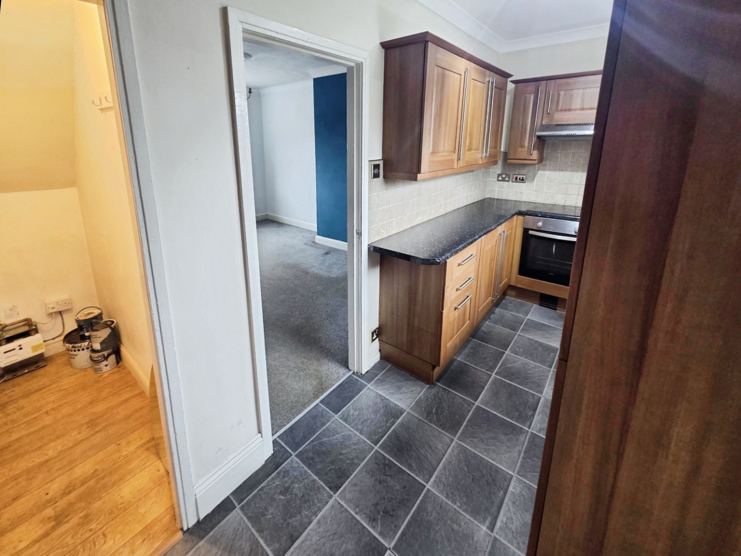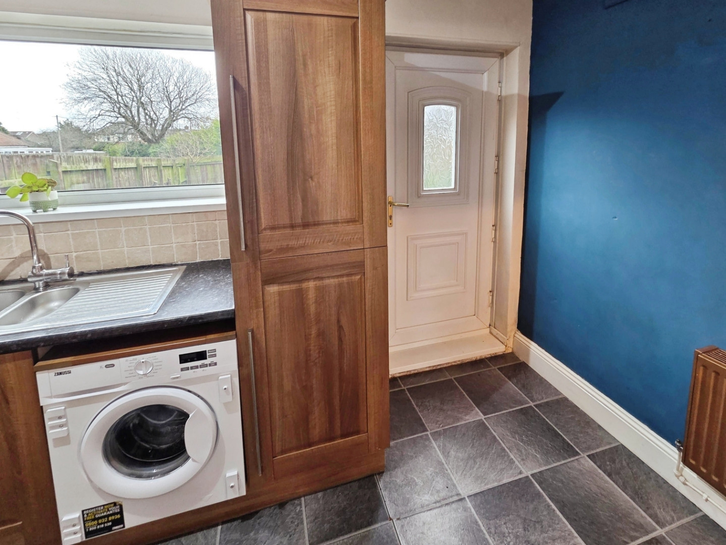 Fitted with a rang of wall and base units having contrasting work surfaces over, integrated electric oven and hob with extraction hood over, plumbing for washing machine, integrated fridge freezer, central heating radiator, under stairs storage cupboard housing the gas boiler and rear entrance door.