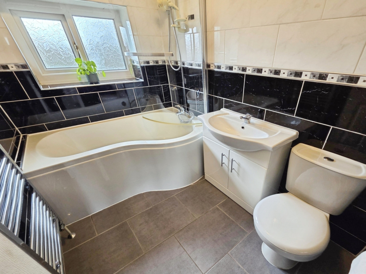 Fitted with a panelled bath having electric shower and screen over, wc, wash hand basin set to vanity unit and chrome heated towel rail.
