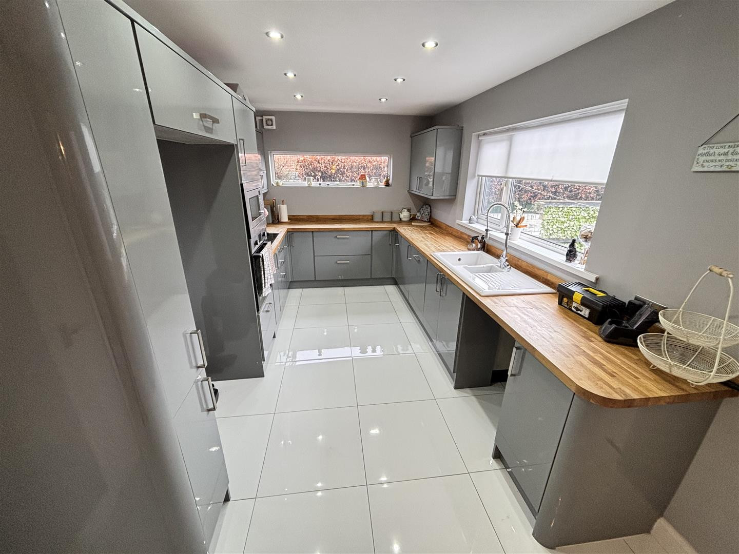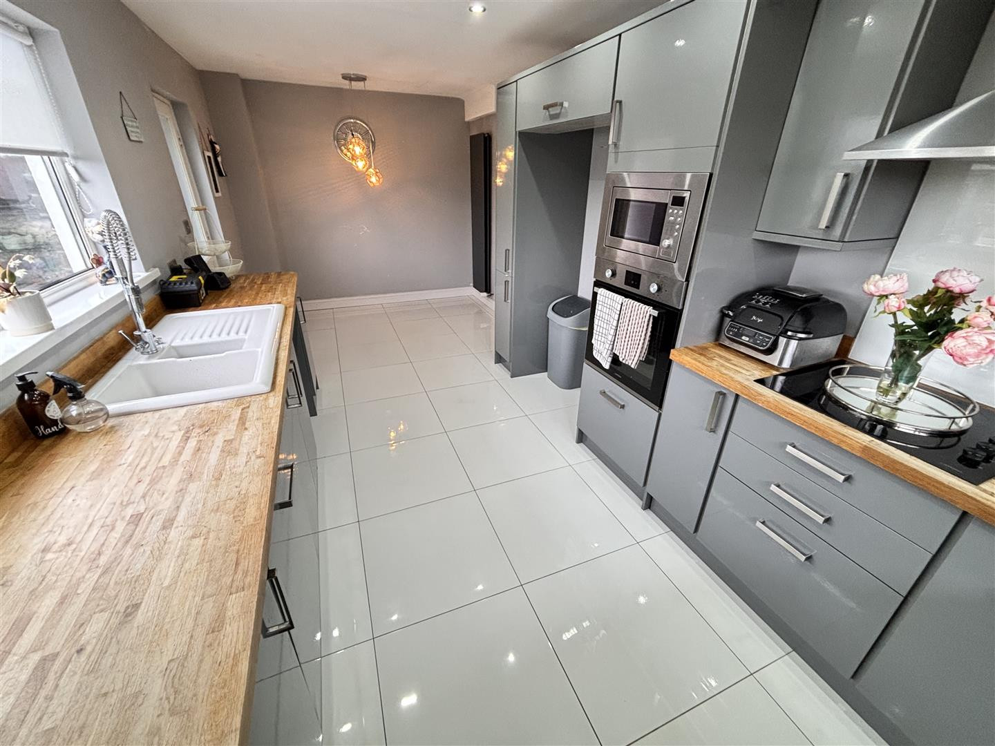 The kitchen has been refitted with a range of contemporary units having contrasting worktops incorporating a sink and drainer unit with mixer tap, a built in stainless steel oven and hob with stainless steel extractor over, along with an integrated microwave and dishwasher. Further features include UPVC double glazed windows to the rear and side, a wall panelled radiator, recessed spotlighting, tiled flooring, plumbing for a washing machine and space for an american style fridge/freezer.