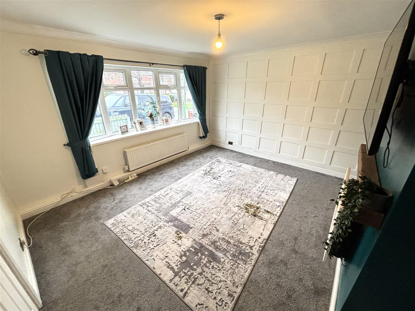 Spacious reception room with a UPVC double glazed bow window to the front, a wall mounted electric fire and radiator.