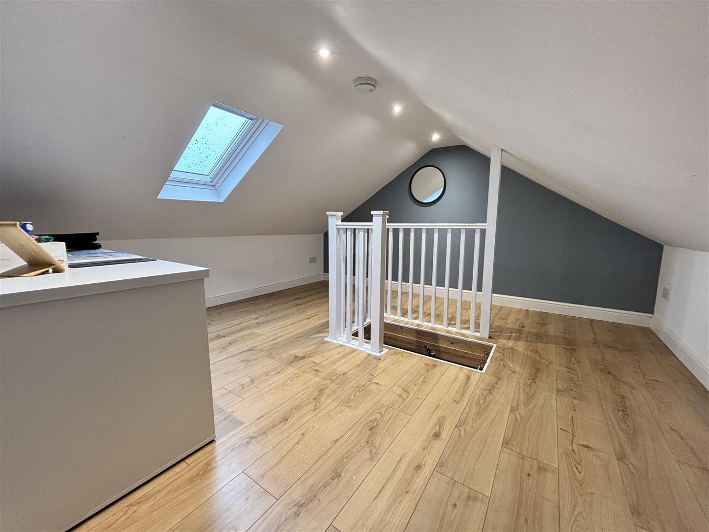 Having a velux window, laminate flooring and access to an additional storage room with light.