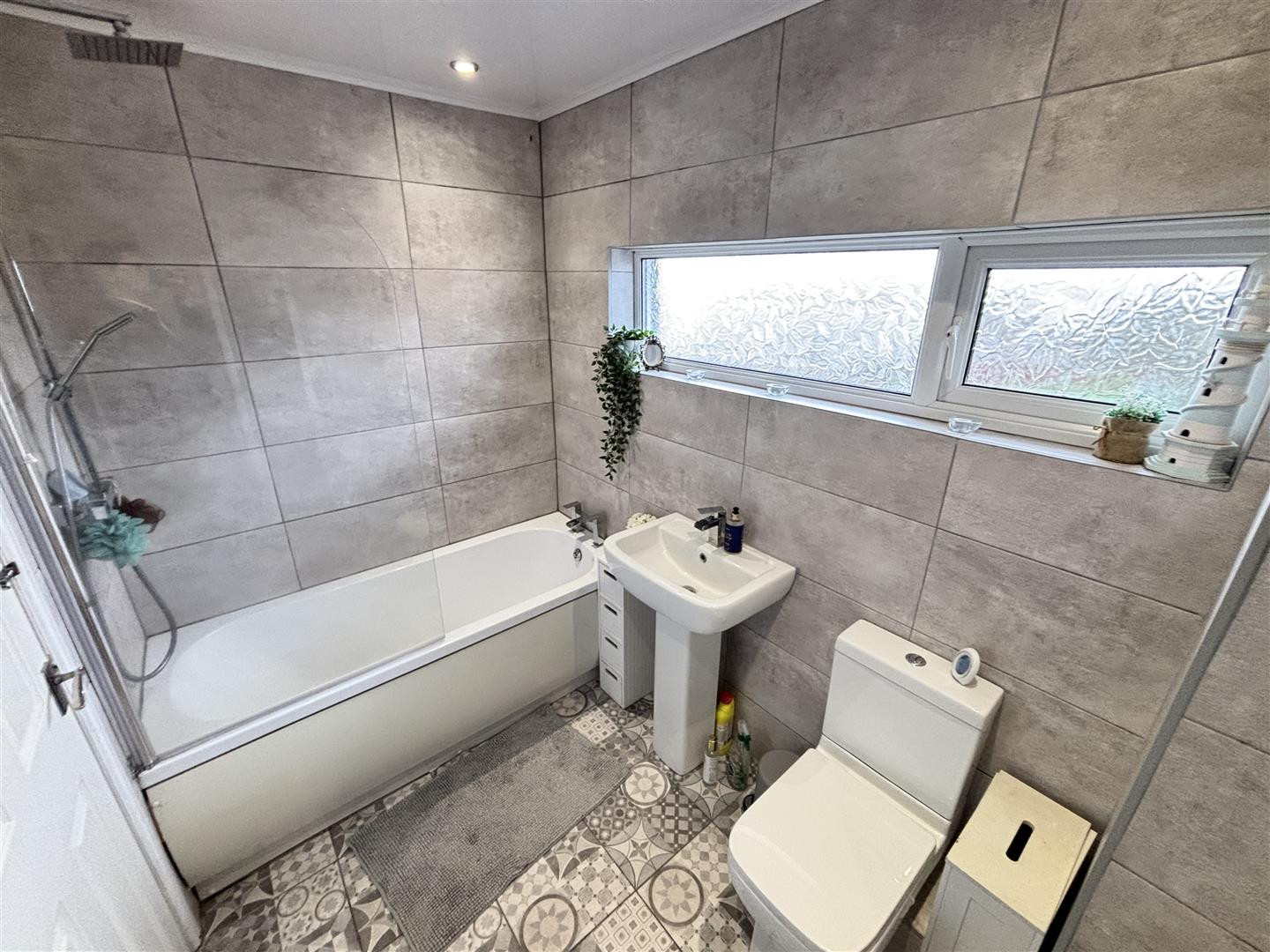 Stylish refitted bathroom comprising of a panelled bath with mains fed shower over, pedestal wash basin and WC. With fully tiled walls, heated towel rail, recessed spotlighting and UPVC double glazed opaque window to the rear.