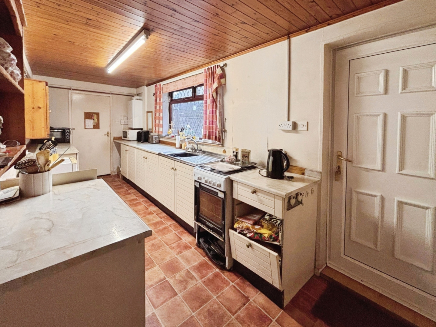 Having wall and base units with contrasting work surfaces over, space for free standing oven, stainless steel sink unit, wall mounted gas boiler upvc double glazed door to rear.