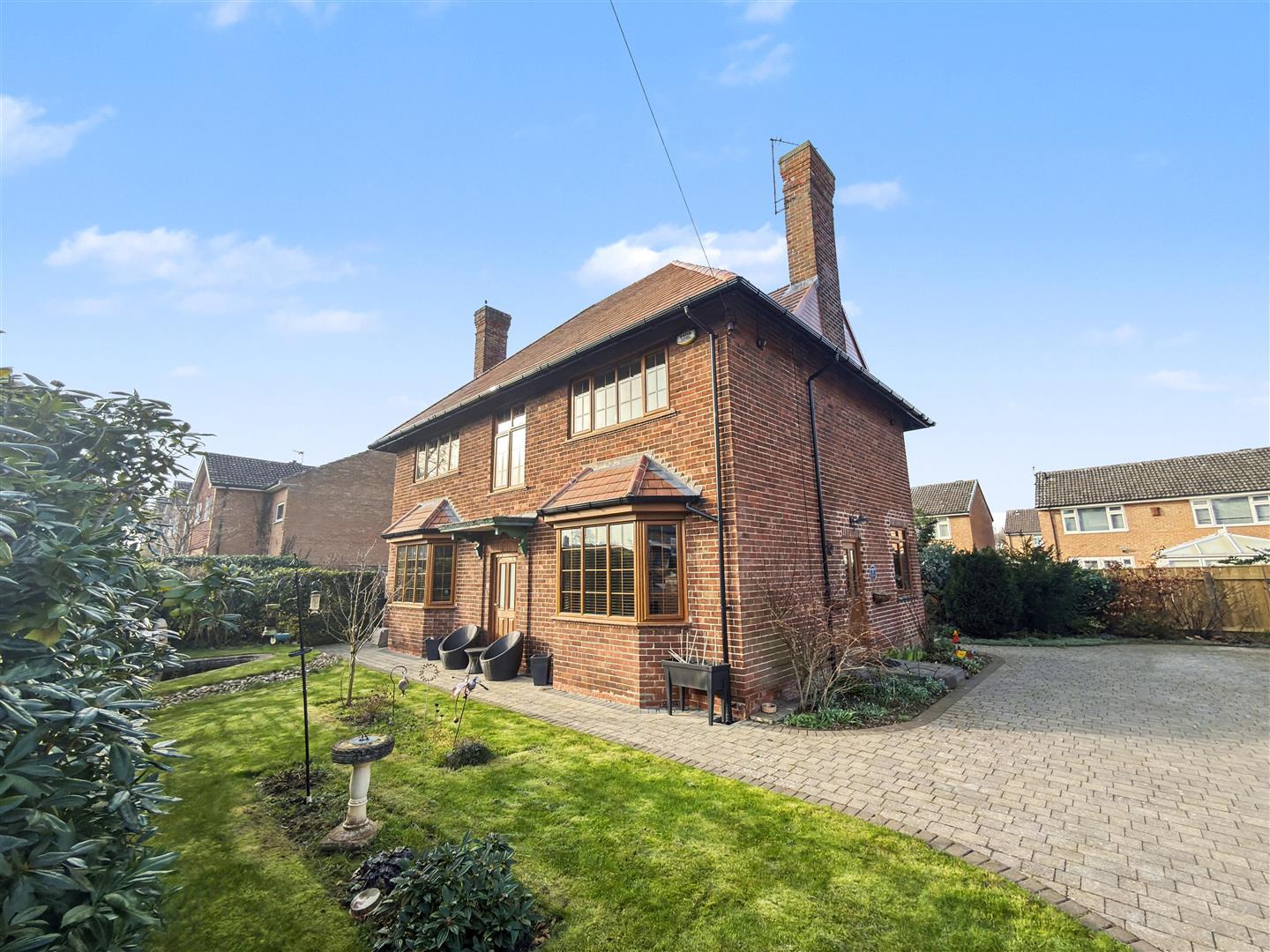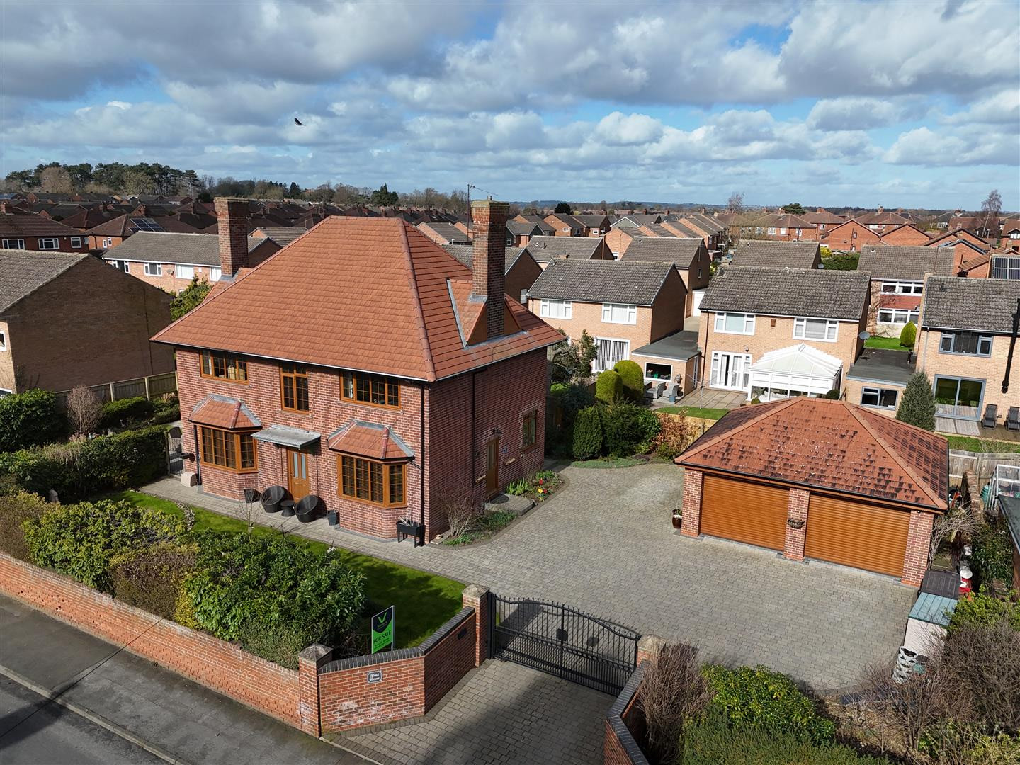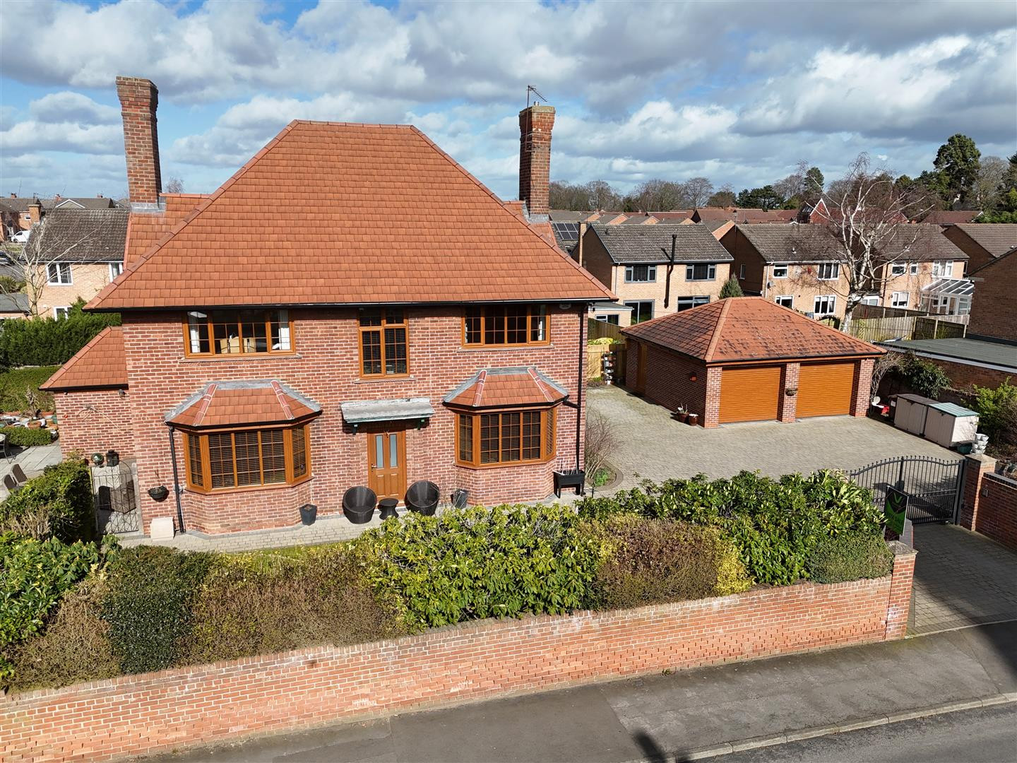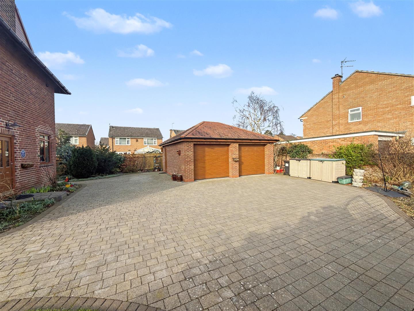Occupying a generous plot, the home is approached through secure electric gates and benefits from extensive outdoor space, excellent parking for multiple vehicles, and a double detached garage—an increasingly rare advantage in this desirable area.