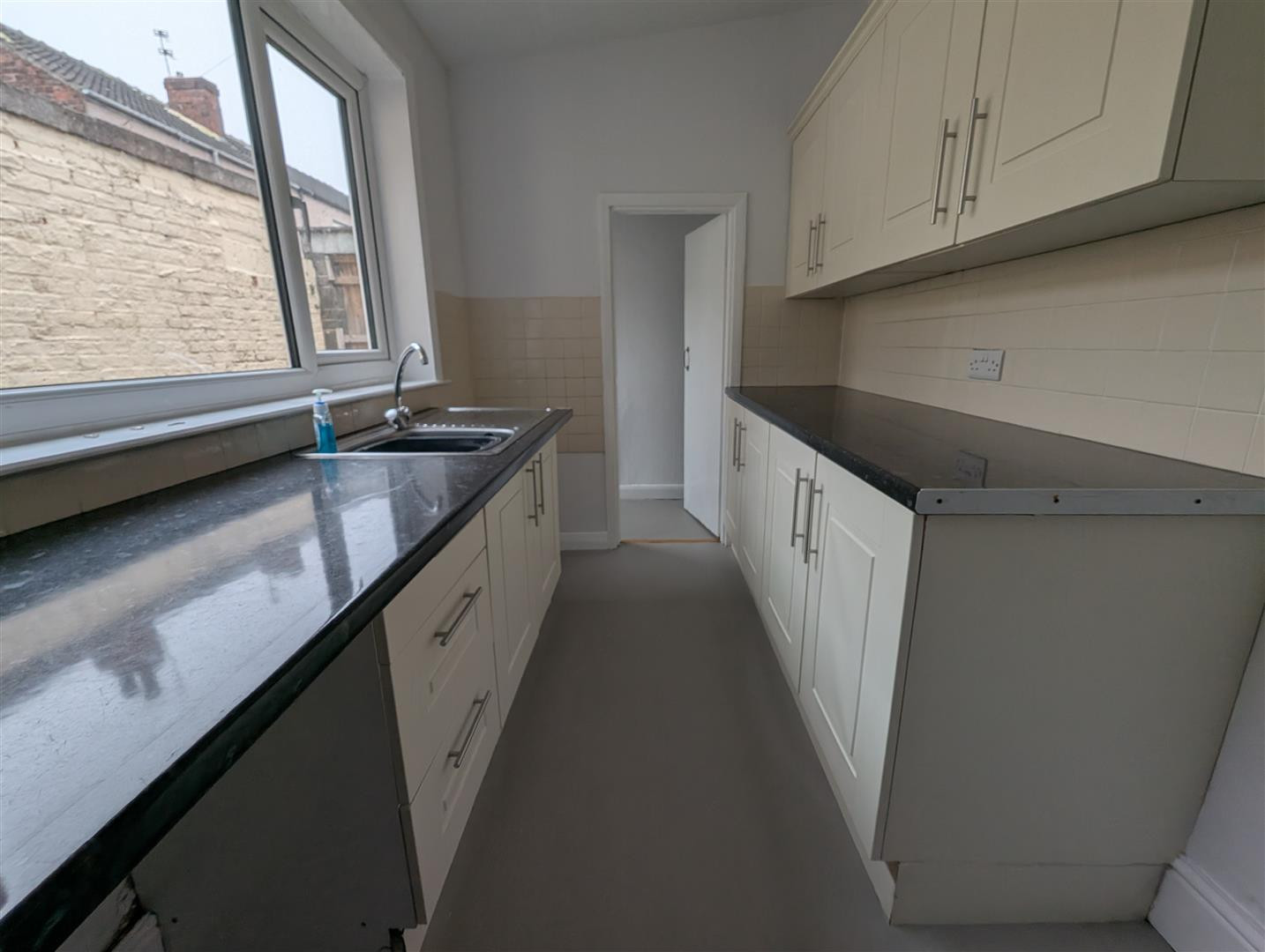 Upvc double glazed window to side, fitted cream wall, base and drawer units with contrasting worktops, stainless steel sink with mixer tap, space for a cooker, washing machine and fridge freezer. Part tiled walls and vinyl floor.