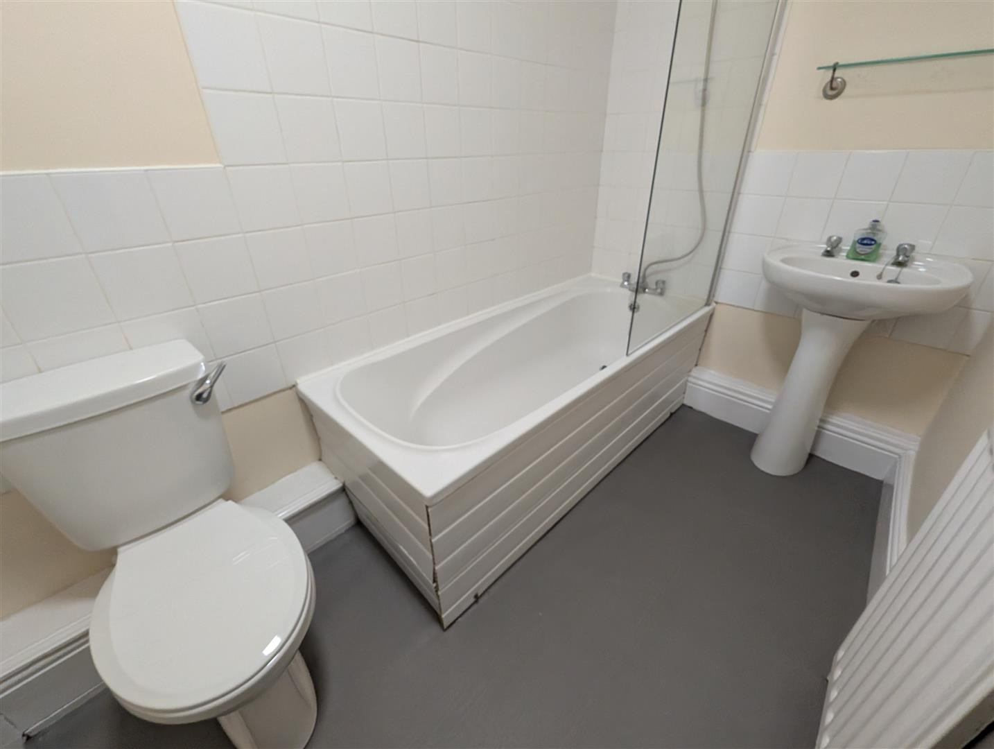 Fitted panelled bath with shower over and screen, low level w.c and wash hand basin. Part tiled walls, vinyl flooring and radiator.