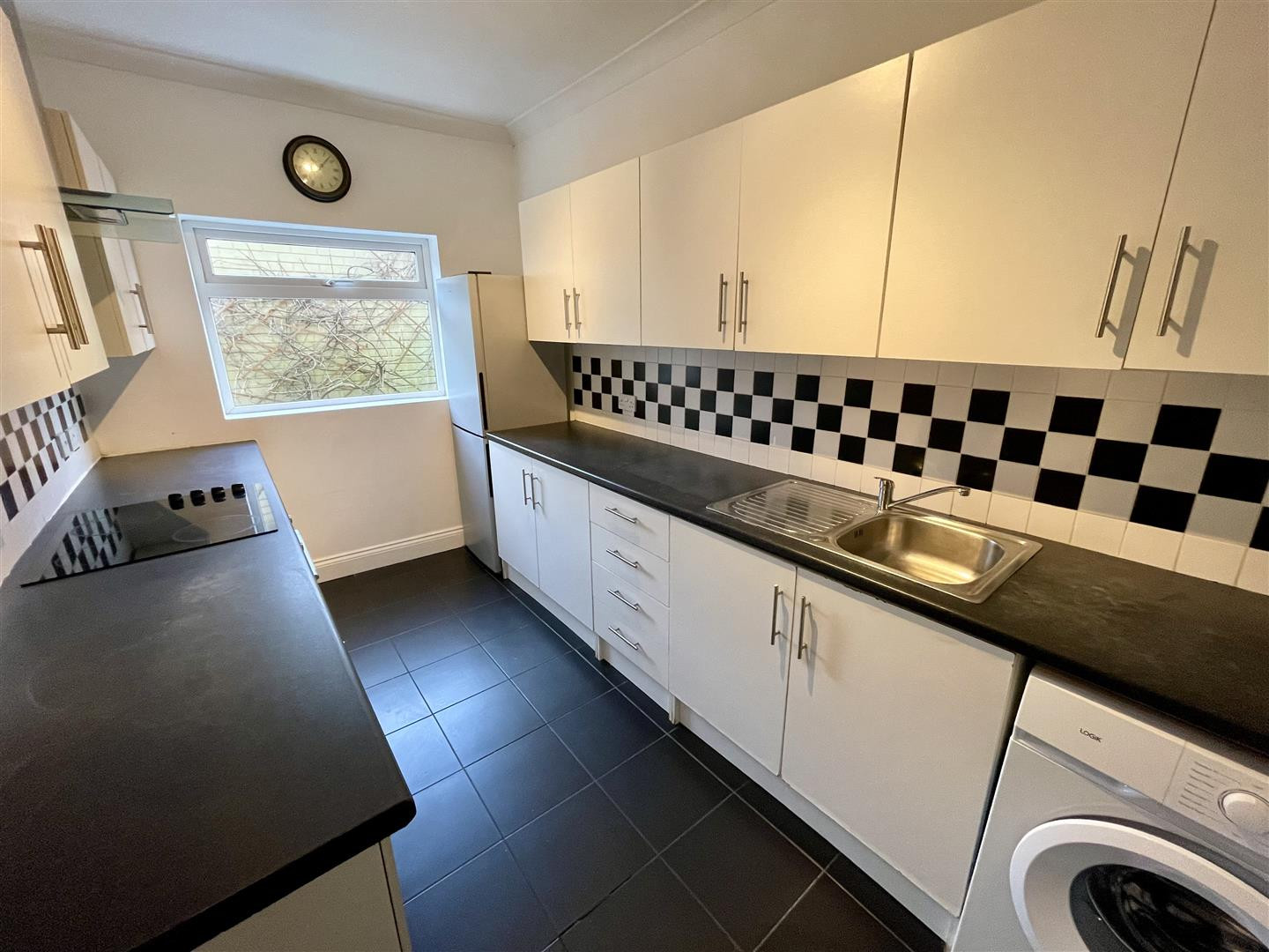 Upvc double glazed window to rear, fitted with wall, base and drawer units, electric hob and oven with extractor over. Stainless steel sink with mixer tap, space for a fridge freezer and washing machine. Radiator and part tiled walls.