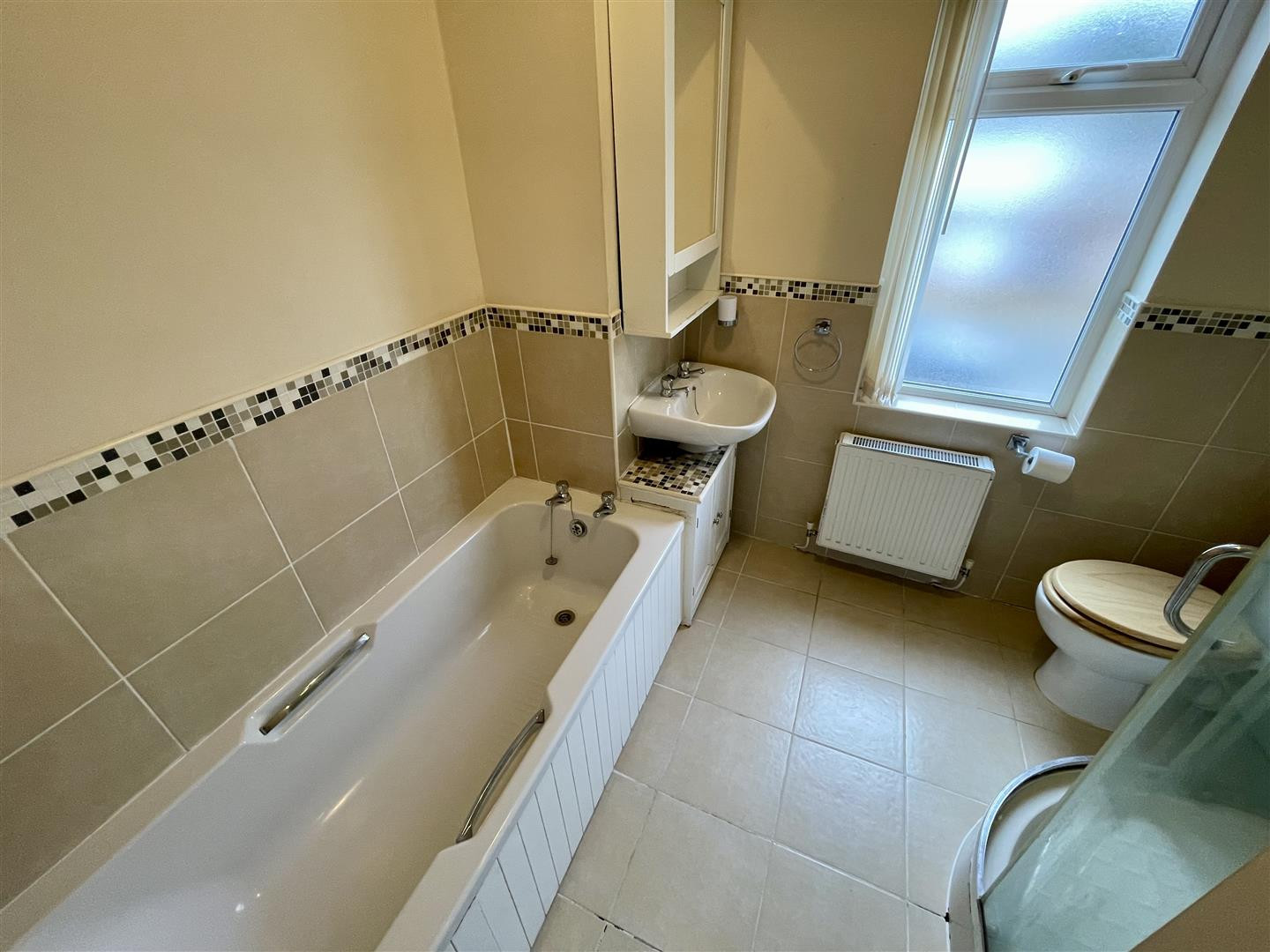 Upvc double glazed obscure window to front, panelled bath, shower cubicle, w.c, wash hand basin in vanity, part tiled walls and radiator.
