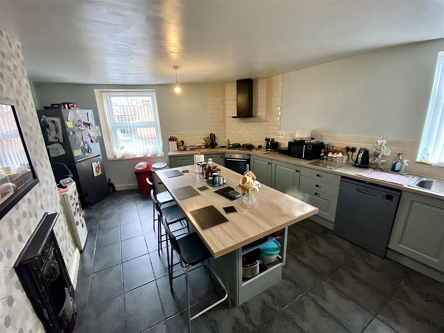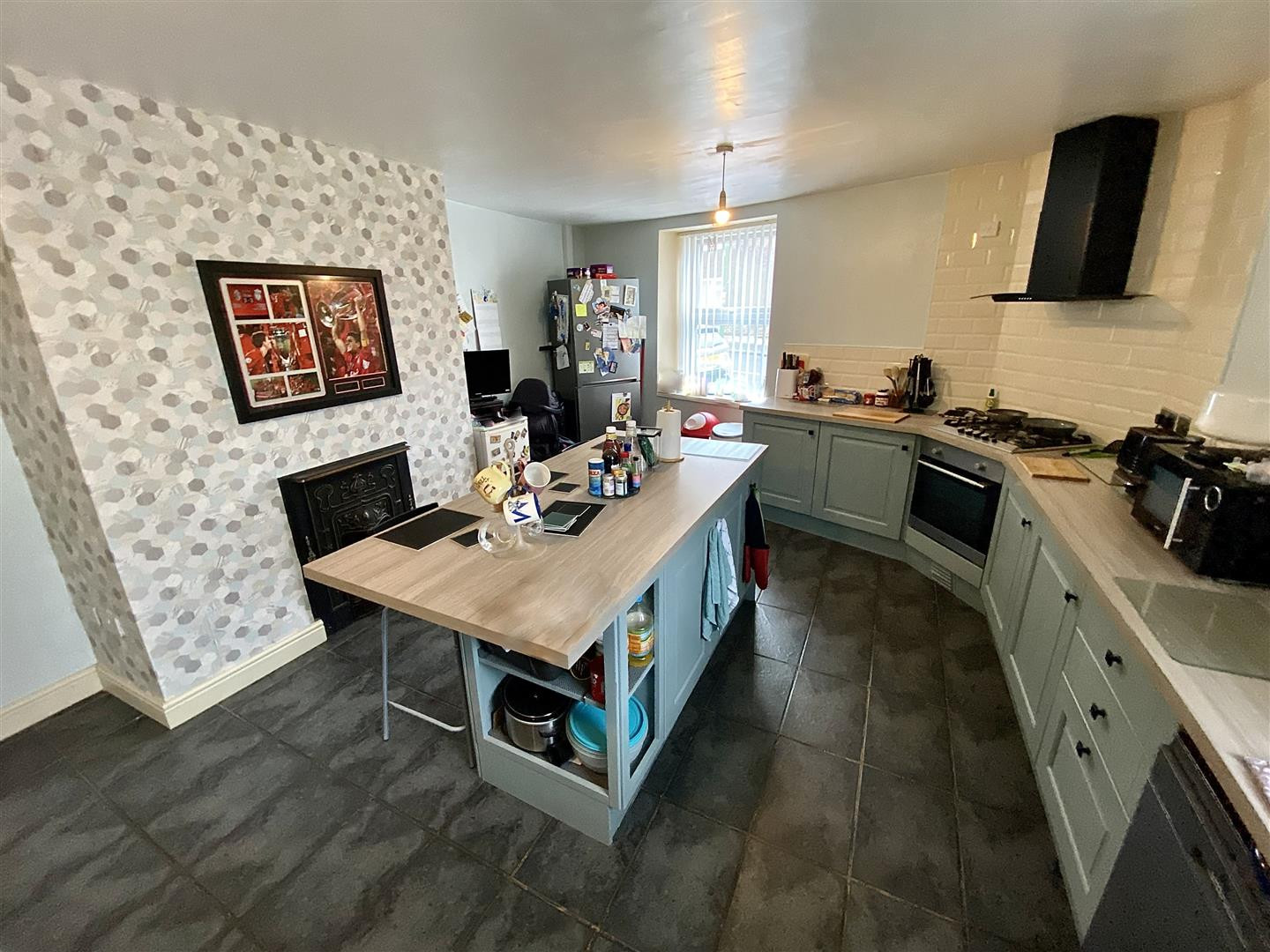 Impressive open plan kitchen and dining room with an island unit, fitted with a range of units having contrasting worktops incorporating a stainless steel sink and drainer unit with mixer tap, a built in stainless steel oven and gas hob with extractor over. Further features include UPVC double glazed windows to the front and side, a feature fireplace, tiled splashbacks and flooring, understairs storage cupboard and radiator.