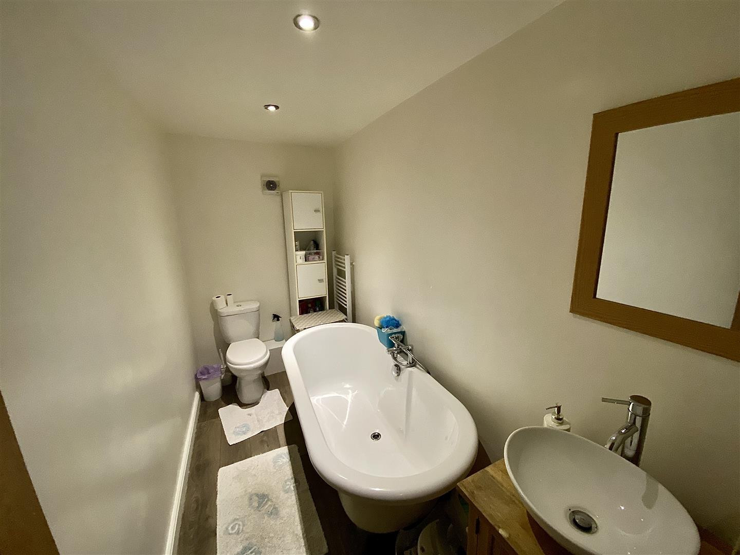 Luxurious family bathroom comprising of a freestanding bath with hand held mixer tap, hand wash basin set to a pedestal unit and WC. Having recessed spotlighting, laminate flooring, heated towel rail and extractor fan.