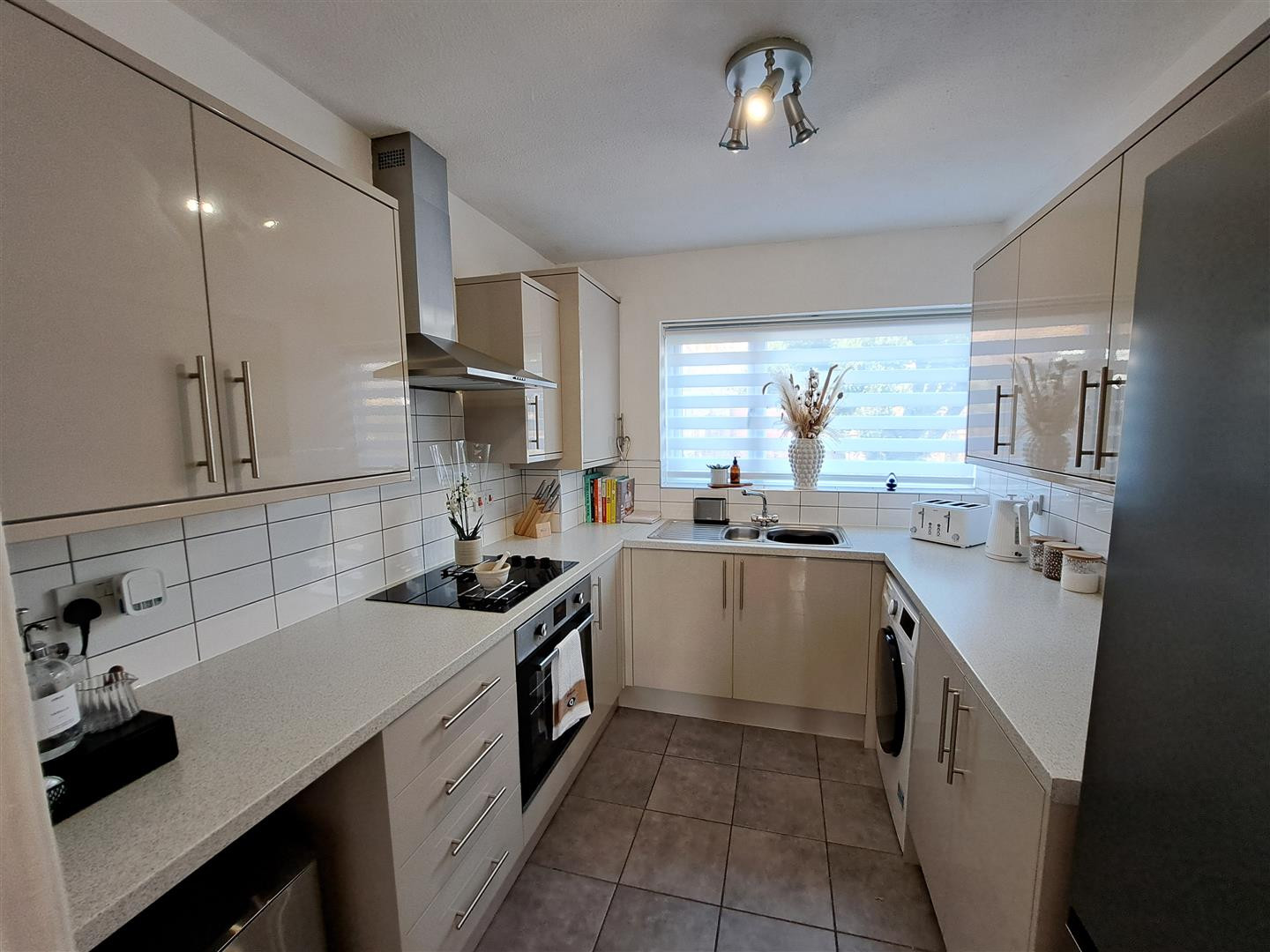 Refitted with a range of wall/base units, ample worktops, sink unit and drainer, splashbacks, built in electric hob/oven/extractor, plumbing for automatic washing machine, UPVC double glazed window, ceramic tiled floor.