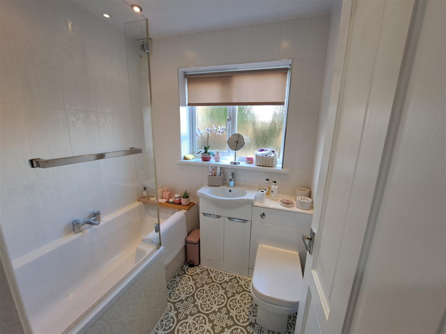 Fitted with panelled bath/shower over, housed low level wc and vanity/storage wash hand basin, fully tiled walls, ceramic tiled floor, heated towel rail, UPVC double glazed window.