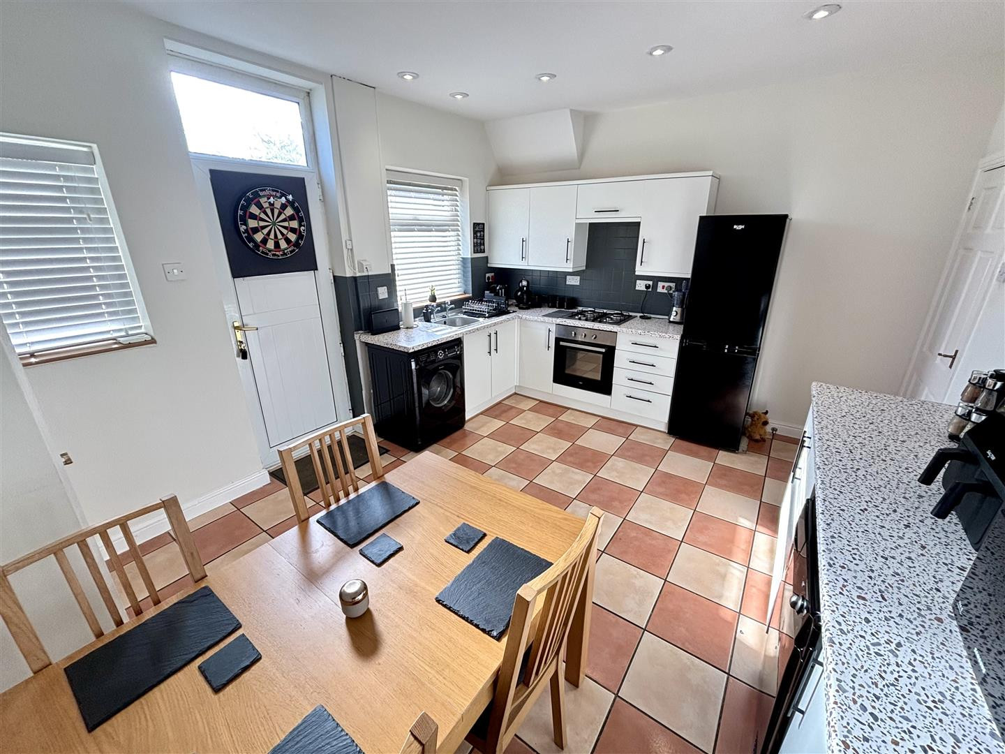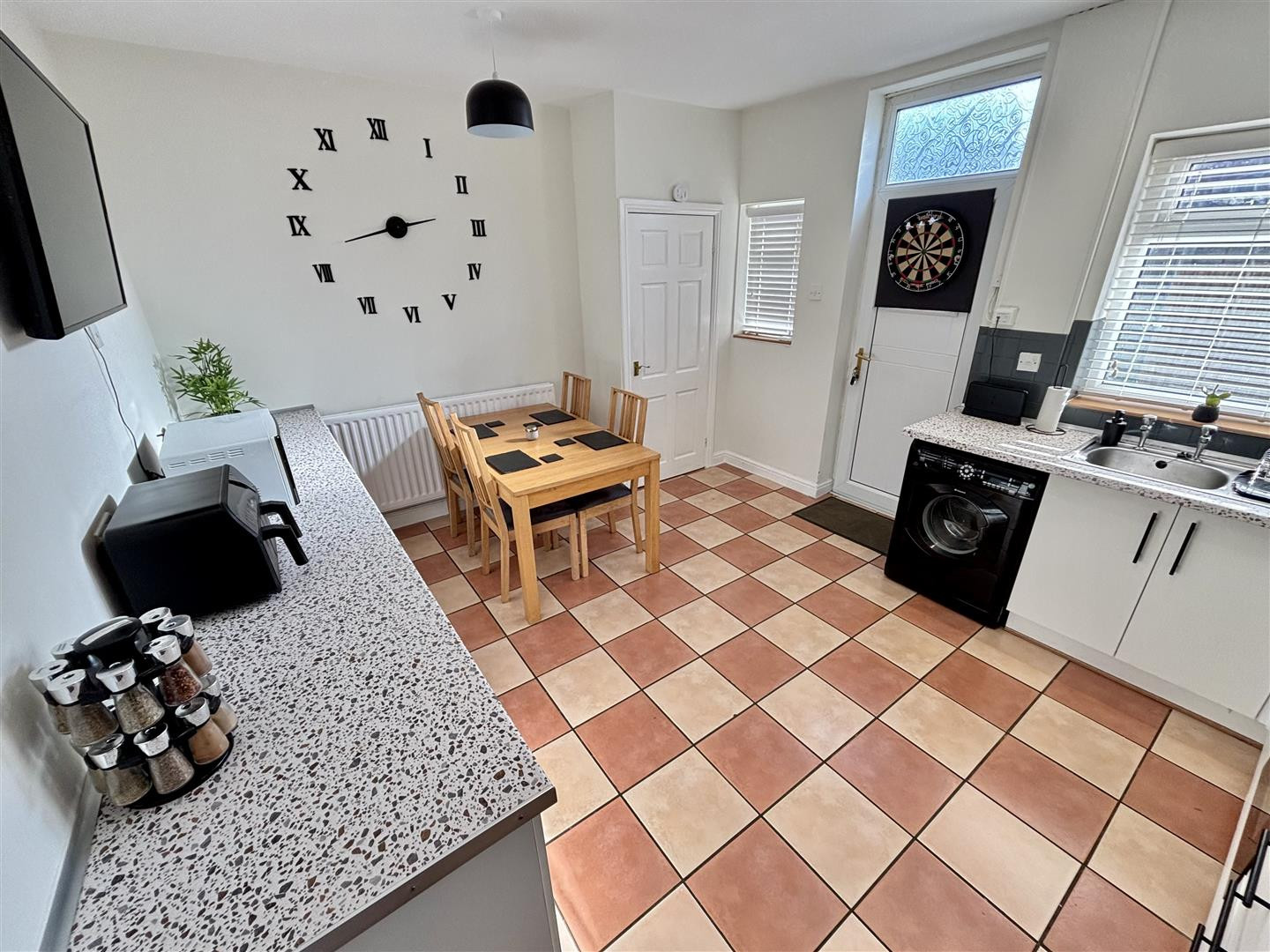 Refitted with a comprehensive range of wall and floor units having contrasting worktops incorporating a stainless steel sink and drainer unit, a built in stainless steel oven and gas hob, plumbing for a washing machine and spaces for both a fridge/freezer and tumble dryer. Further features include two UPVC double glazed windows to the rear, tiled splashbacks and flooring, a radiator, a cupboard housing the combi gas central heating boiler and a UPVC door to the rear yard.