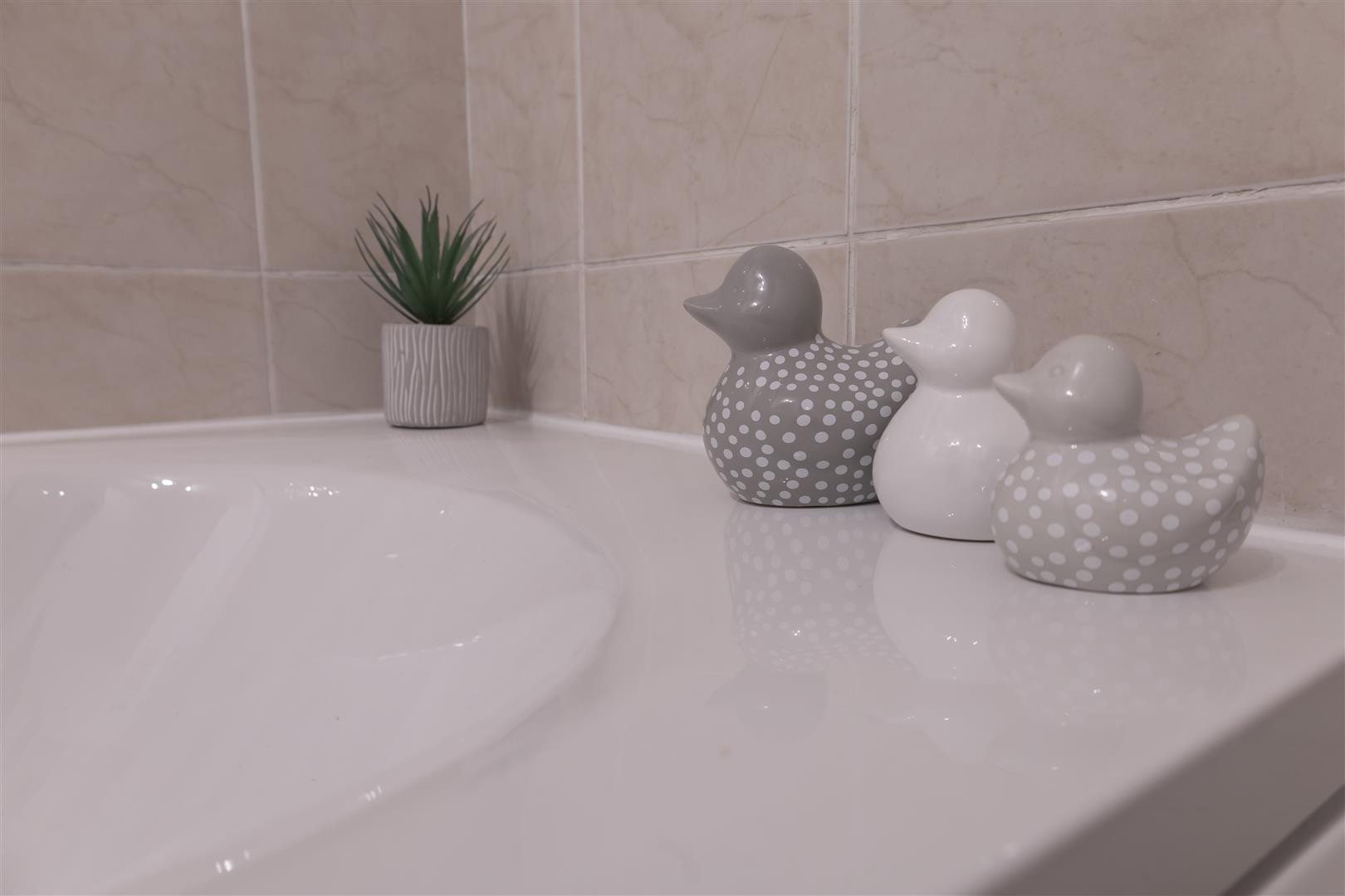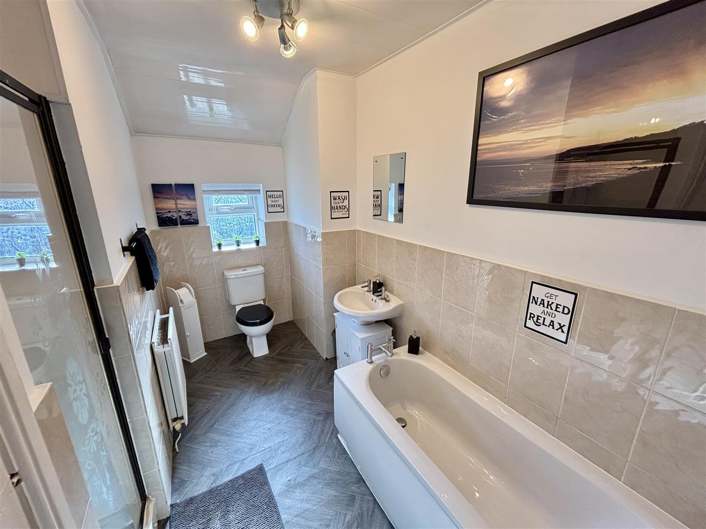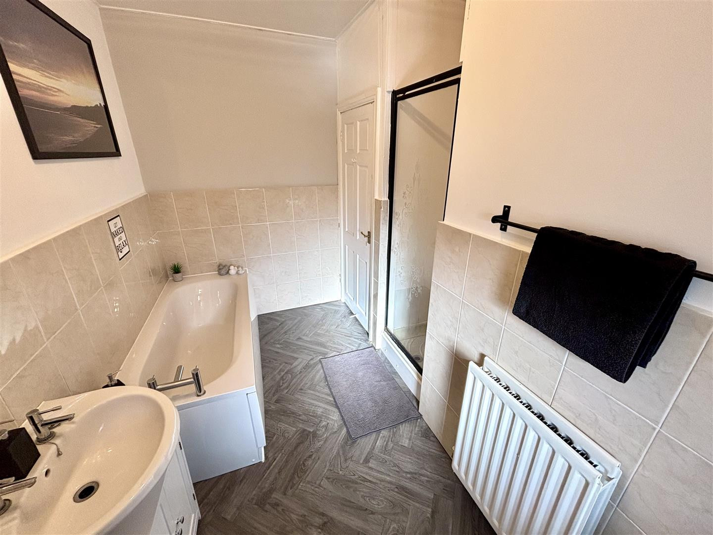 Stylish bathroom comprising of a recently fitted panelled bath, cubicle with electric shower, pedestal wash basin and WC. Having a UPVC double glazed opaque window to the rear, tiled splashbacks and a radiator.