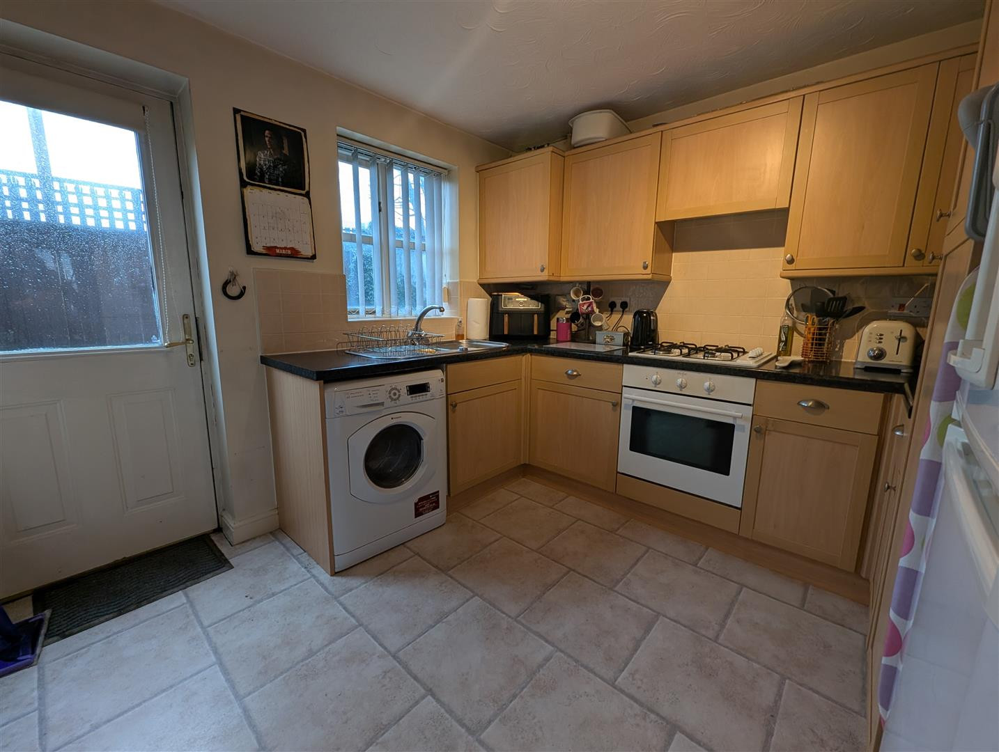 Window to rear, fitted wall, base and drawer units with contrasting work surfaces, integrated gas hob with electric oven and extractor over. Space for a washing machine and fridge freezer, part tiled walls and radiator. Door to rear.