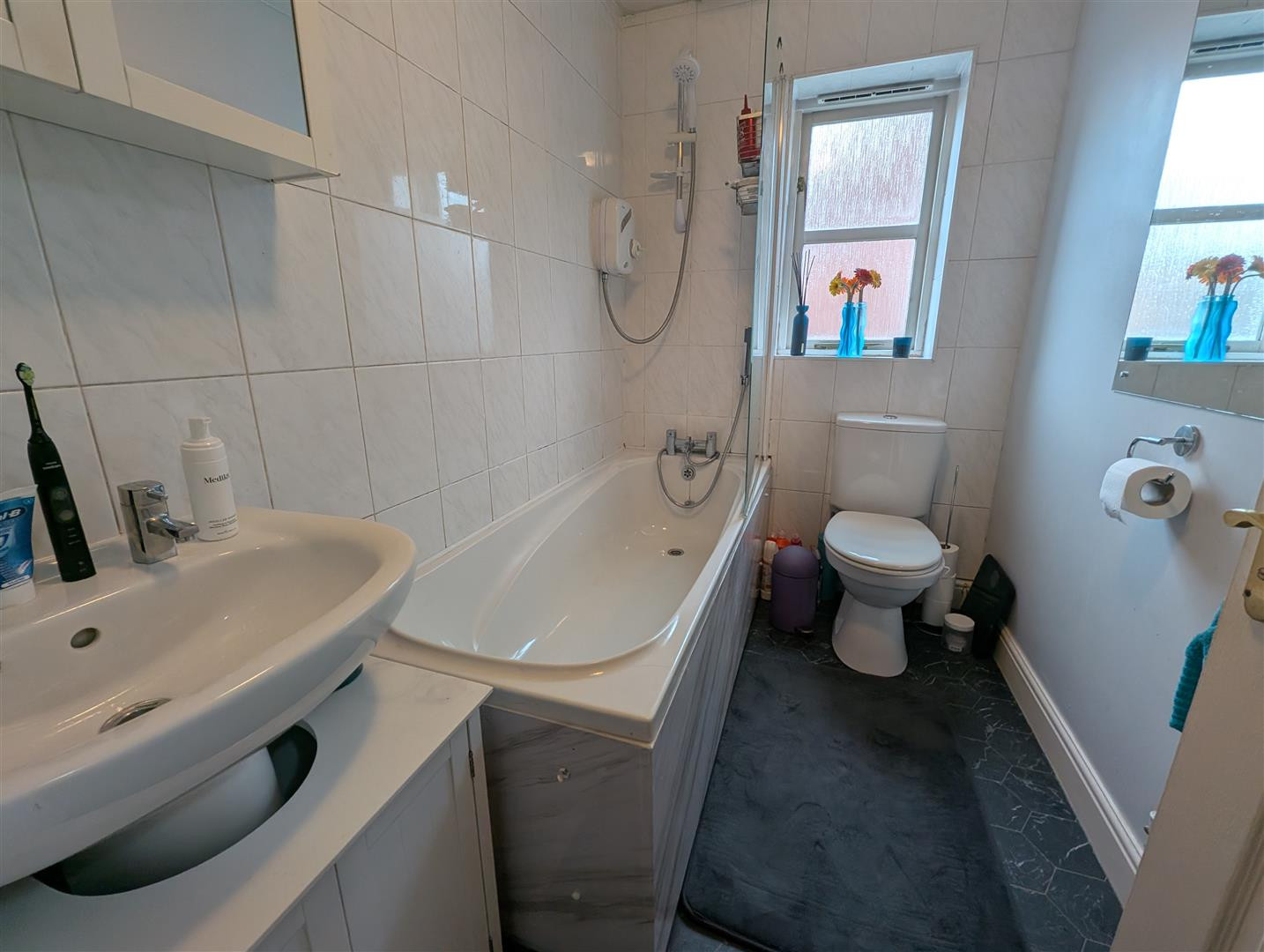 Double glazed obscure window to side, panelled bath with shower over and screen, wash hand basin and low level wc. Extractor fan, part tiled walls and radiator.