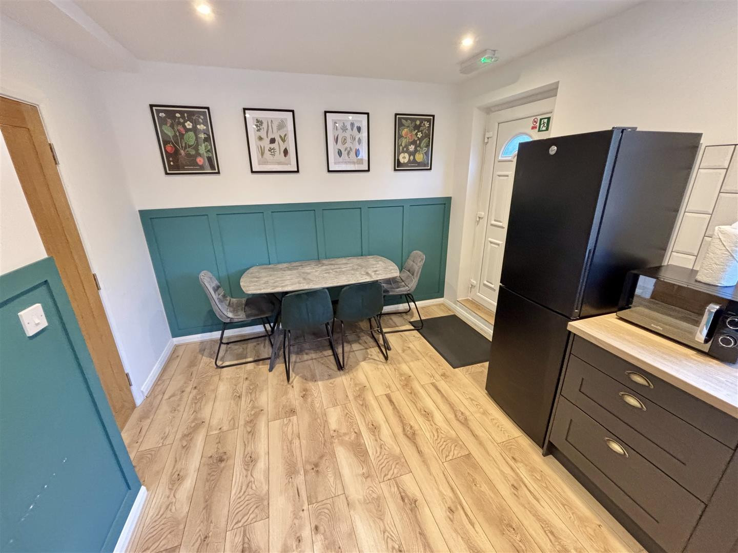 Fitted with a comprehensive range of units having contrasting worktops incorporating a stainless steel sink and drainer unit with mixer tap, a built in electric oven and hob with extractor over, an integrated washing machine and fridge/freezer space. Further features inside tiled splashbacks, laminate flooring, recessed spotlighting, a radiator, a UPVC double glazed window to the rear and UPVC external door to the rear garden.