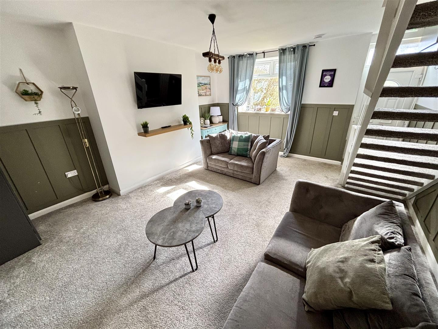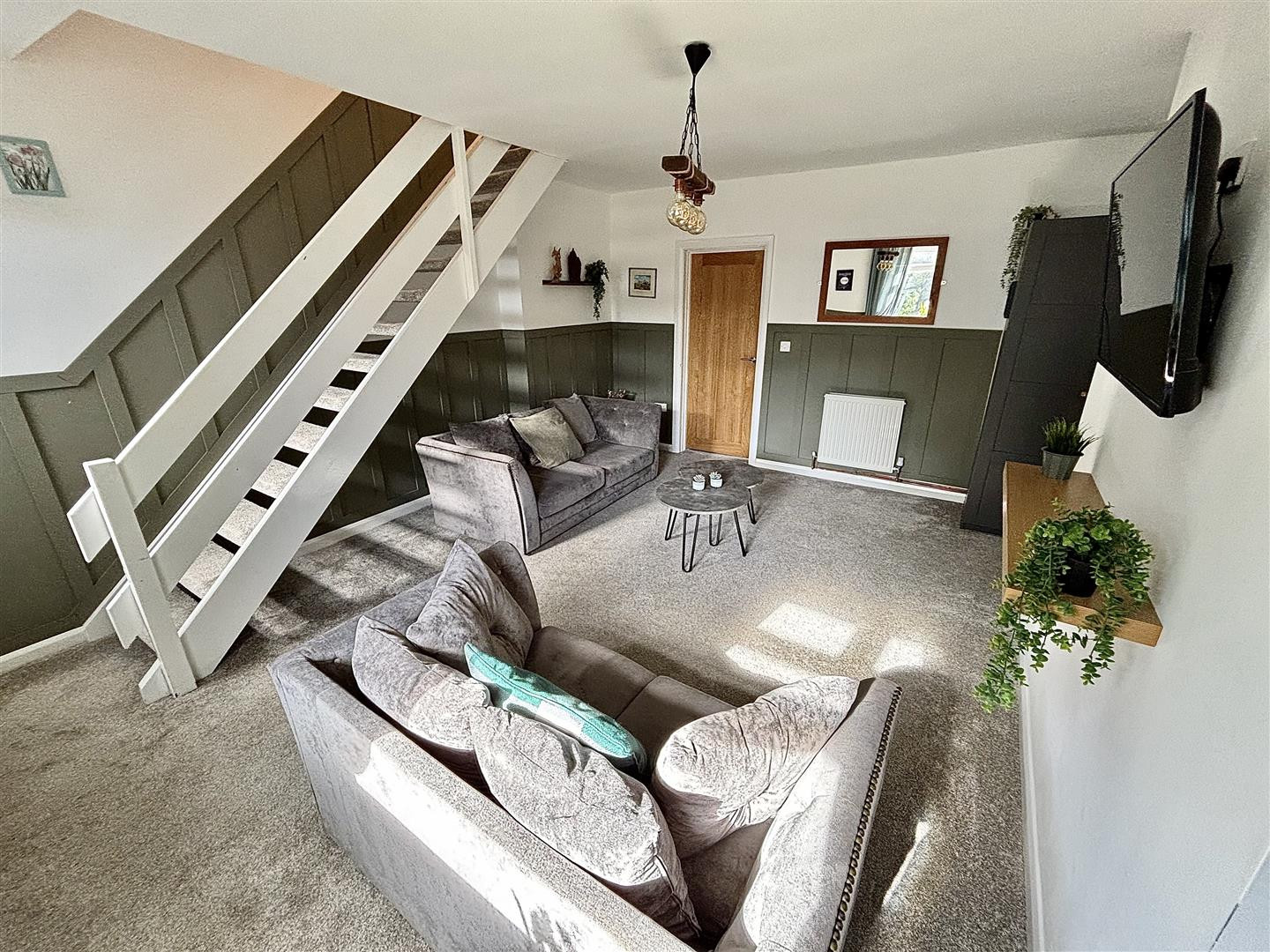 Spacious reception room entered via UPVC door. Having a UPVC double glazed window to the front, stairs leading to the first floor, a radiator and storage cupboard which also houses the electric combi central heating boiler.