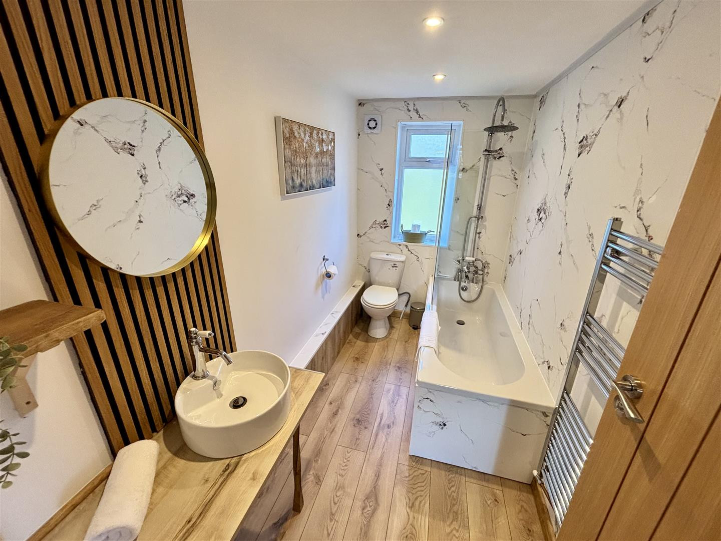 Stylish bathroom comprising of a panelled bath with mains fed shower over, WC and hand wash basin set to a bespoke vanity unit. Having a UPVC double glazed opaque window to the rear, heated towel rail, recessed spotlighting, laminate flooring and extractor fan.