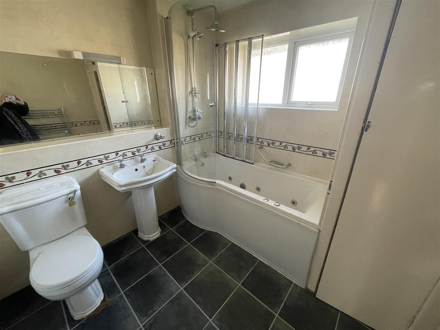 The first floor features three bedrooms, one of which is fitted with wardrobes, providing ample storage space. The white bathroom, complete with a WC.