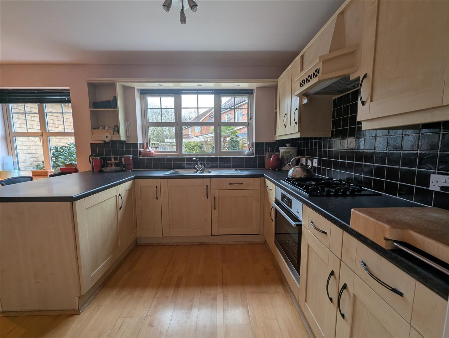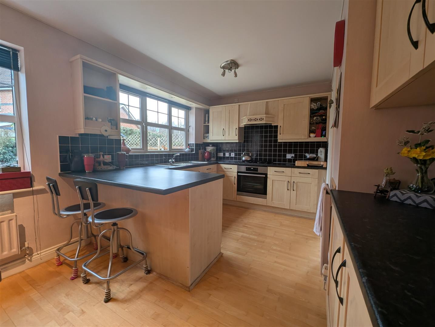 Upvc double glazed window to rear, Beech wall, base and drawer units with contrasting work tops including breakfast bar. Stainless steel sink with mixer tap. Four ring gas hob with extractor over and oven. Integrated fridge freezer and part tiled walls.