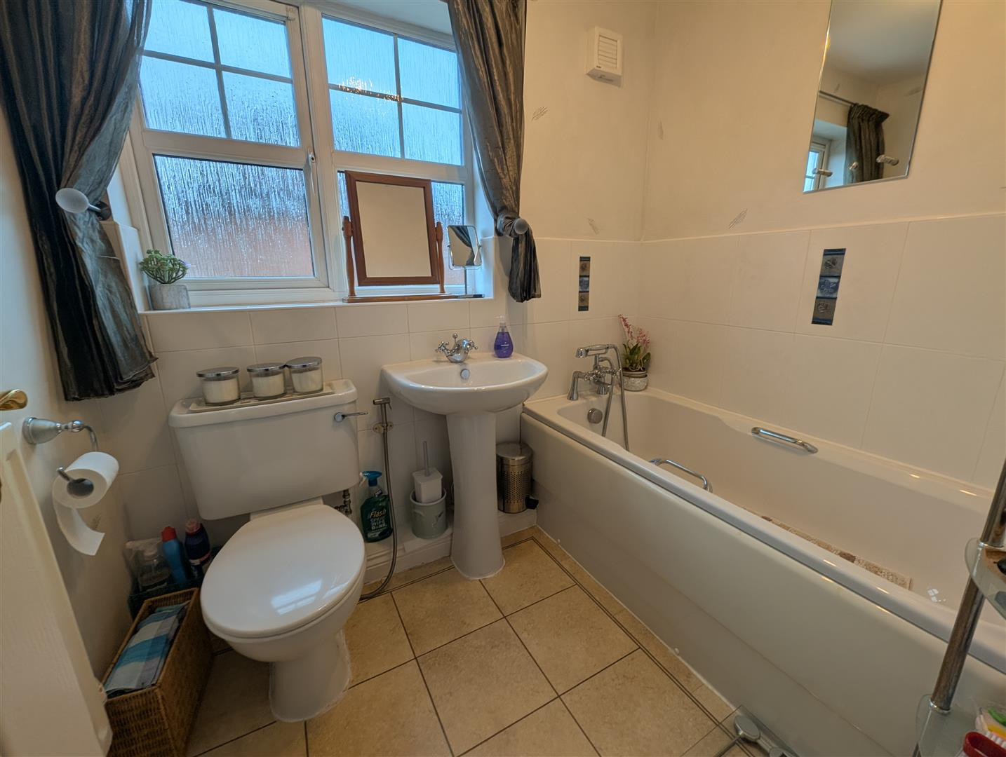 Upvc double glazed obscure window to side, panelled bath with shower mixer, low level w.c with spray, wash hand basin, part tiled walls and radiator.