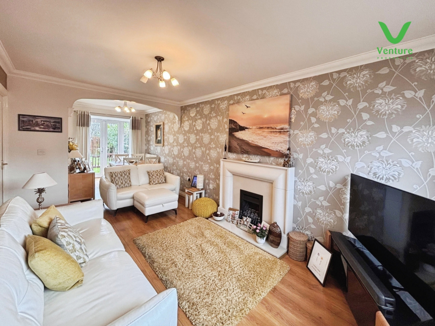 With Contemporary fireplace, marble inset and hearth with living flame gas fire, UPVC double glazed window to front elevation, laminated floor, coving to ceiling, tv point, decorative arch, double central heating radiator and central heating radiator, UPVC double glazed French doors and side panel to rear elevation