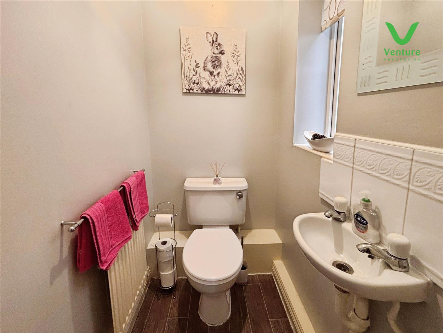 With a white suite including wc, wash hand basin, tiled splash backs, central heating radiator and opaque UPVC double glazed window