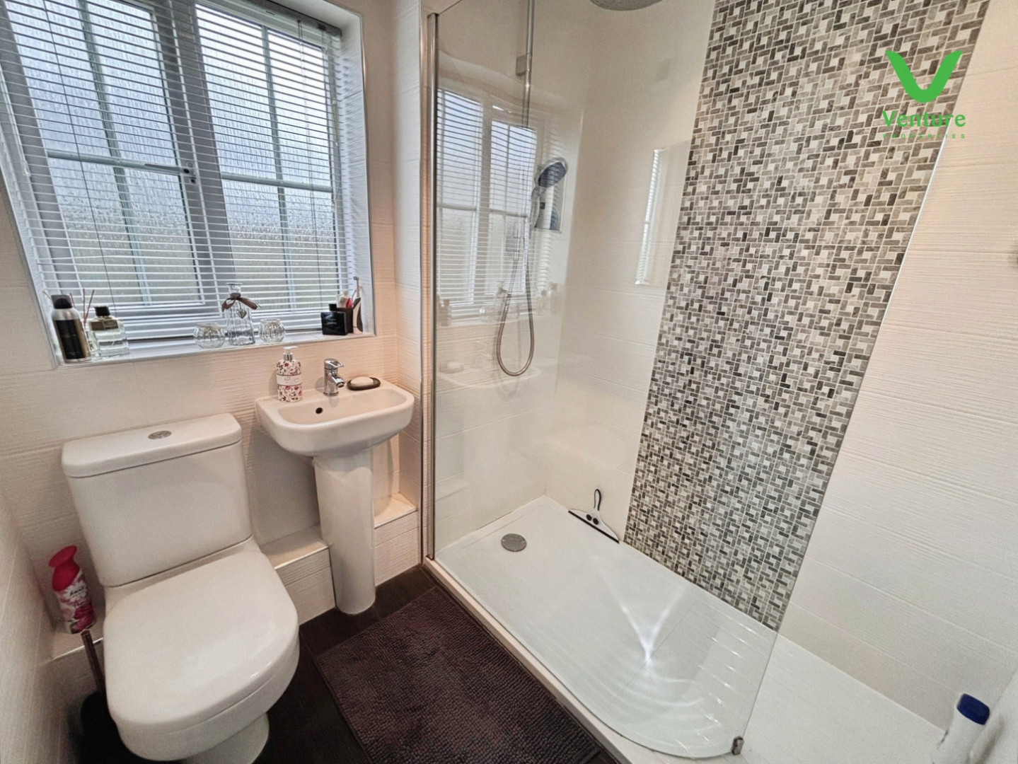 Fitted with waterfall shower, wc, pedestal wash hand basin, opaque UPVC double glazed window, tiled splash backs, and central heating radiator