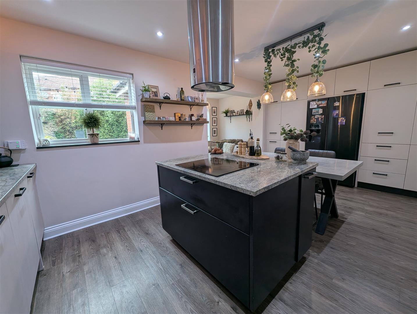 Upvc double glazed window to rear, Cashmere wall, base and drawer units and contrasting Granite worktops. Inset stainless steel sink with mixer tap, four ring Neff hob in island with extractor over and storage under, including deep pan drawer. Integrated eye level Neff oven and microwave. Integrated American style fridge freezer, dishwasher and washing machine/tumble drier. Feature heated towel rail and Karndean flooring. Open aspect to Garden room.