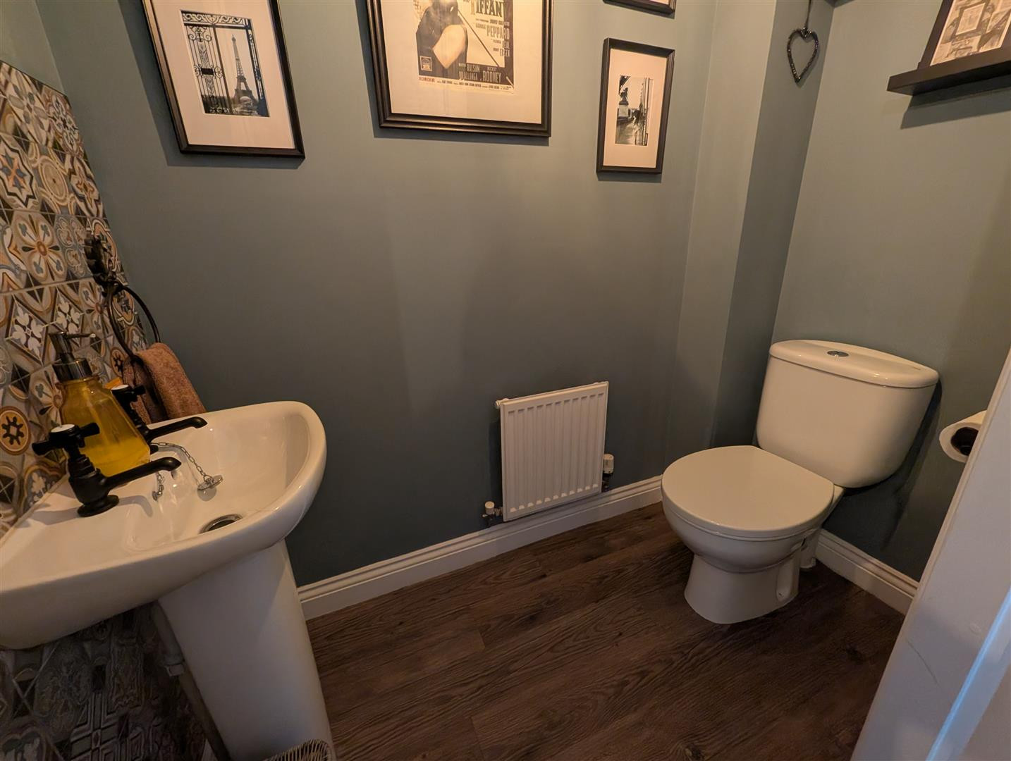 Low level w.c, wash hand basin, radiator and part tiled walls. Karndean flooring.