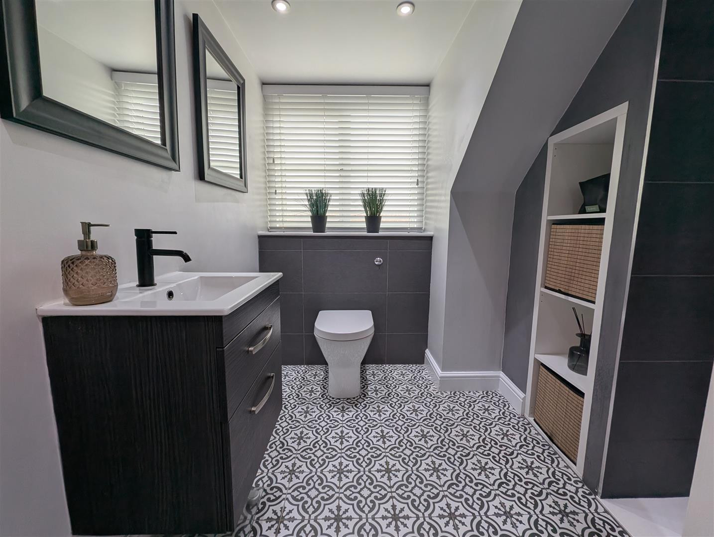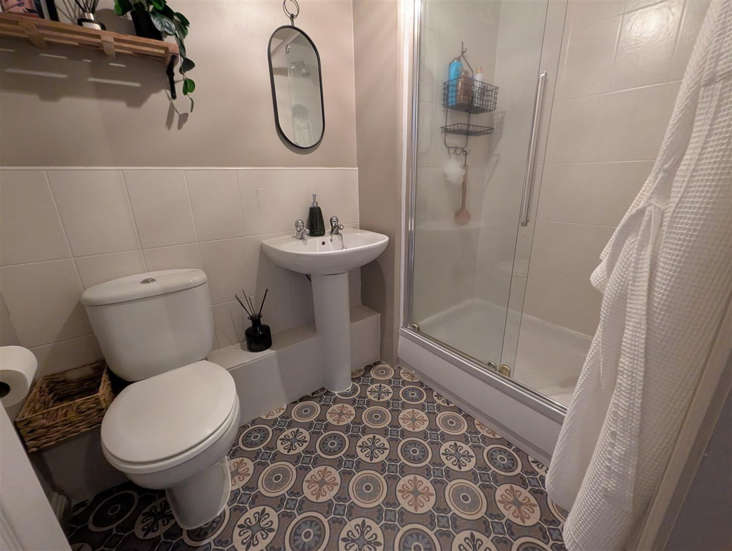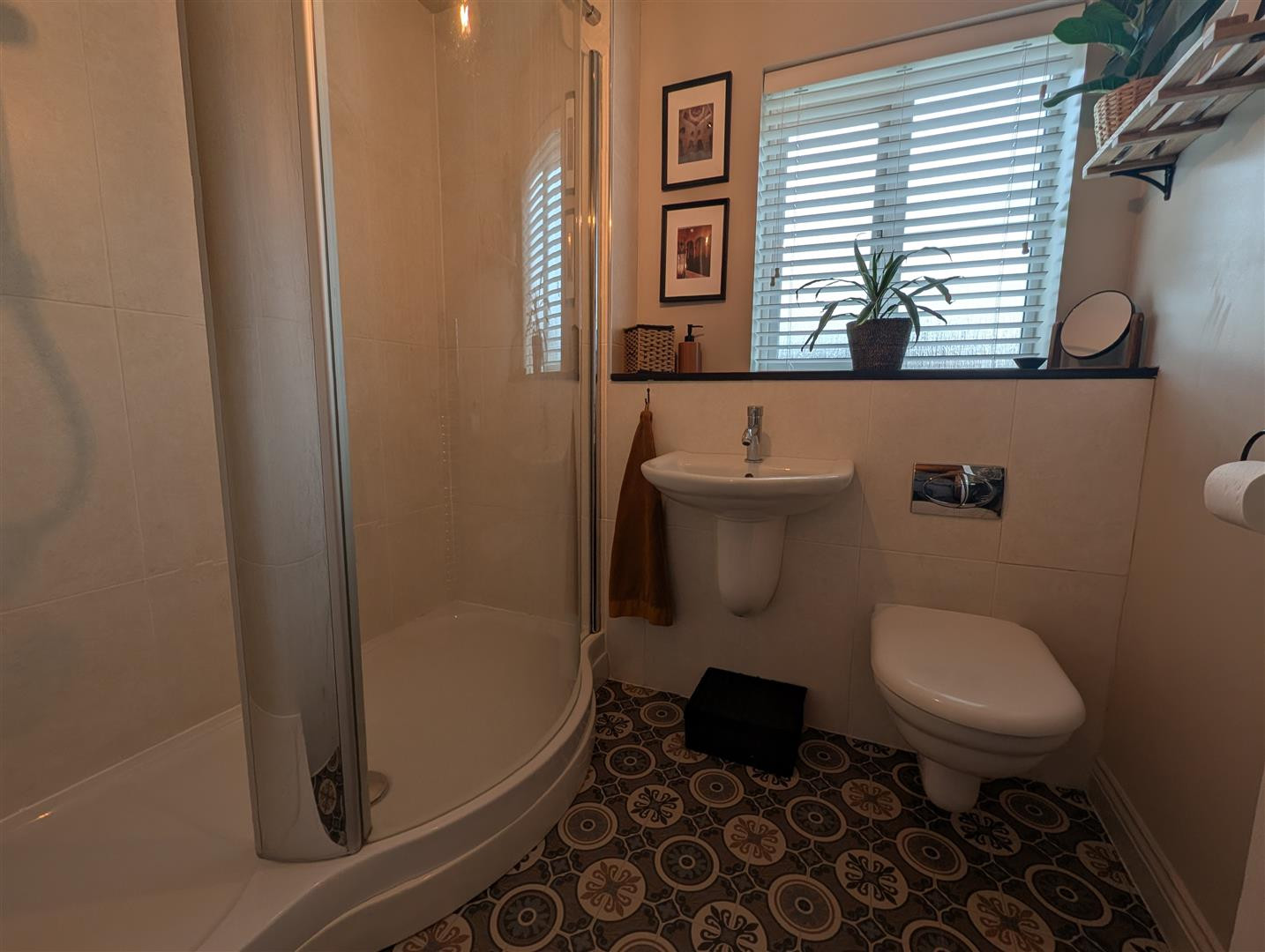 Upvc double glazed obscure window to front, double walk in shower, low level, floating, back to wall w.c, walll mounted wash hand basin, heated towel rail and Amtico flooring.