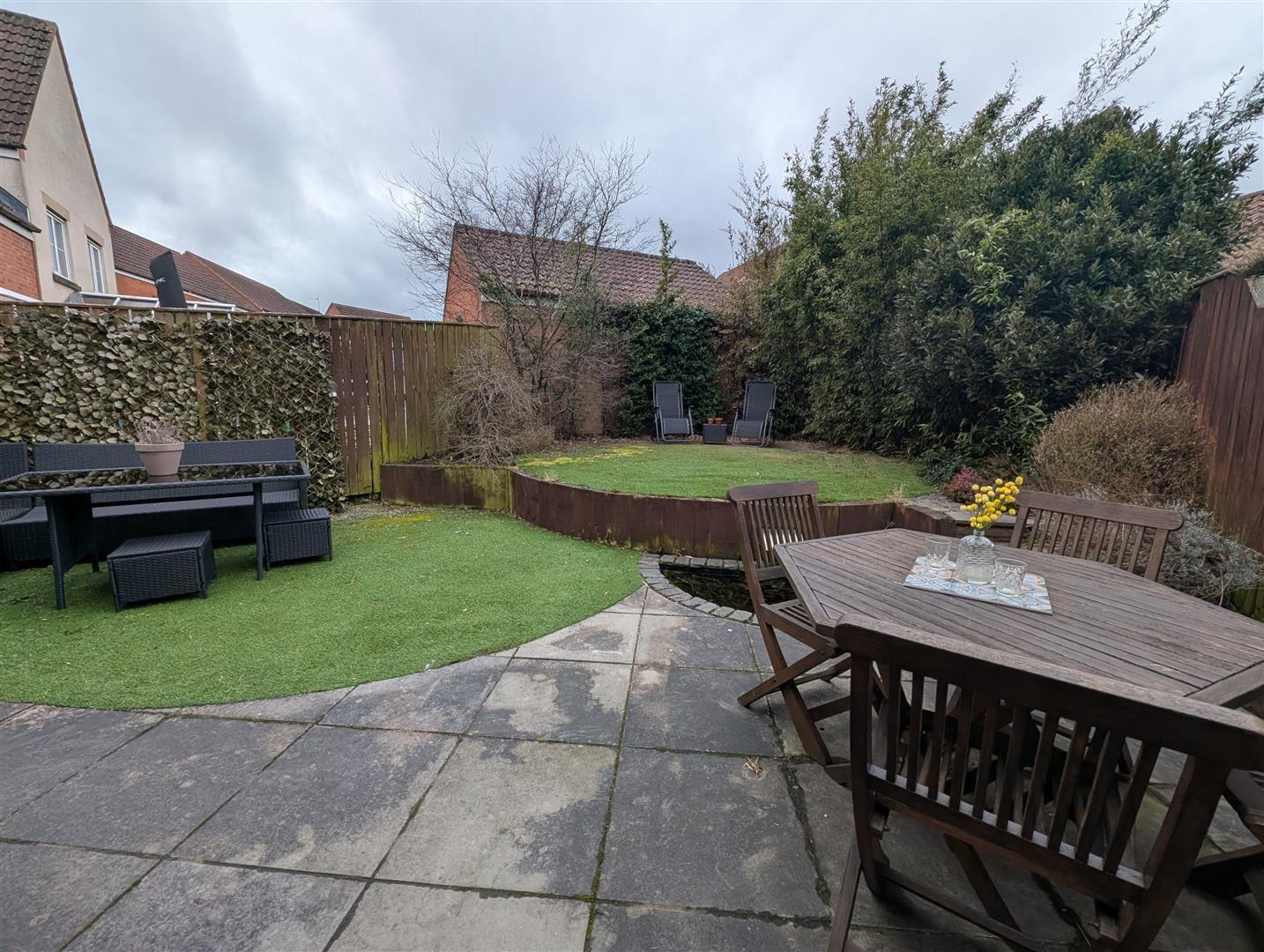 To the rear is an enclosed landscaped garden with black slate patio and sun terrace. There is a pond enclosed with mature shrubs, well stocked flowering borders, Astroturf, exterior lighting and a water tap.