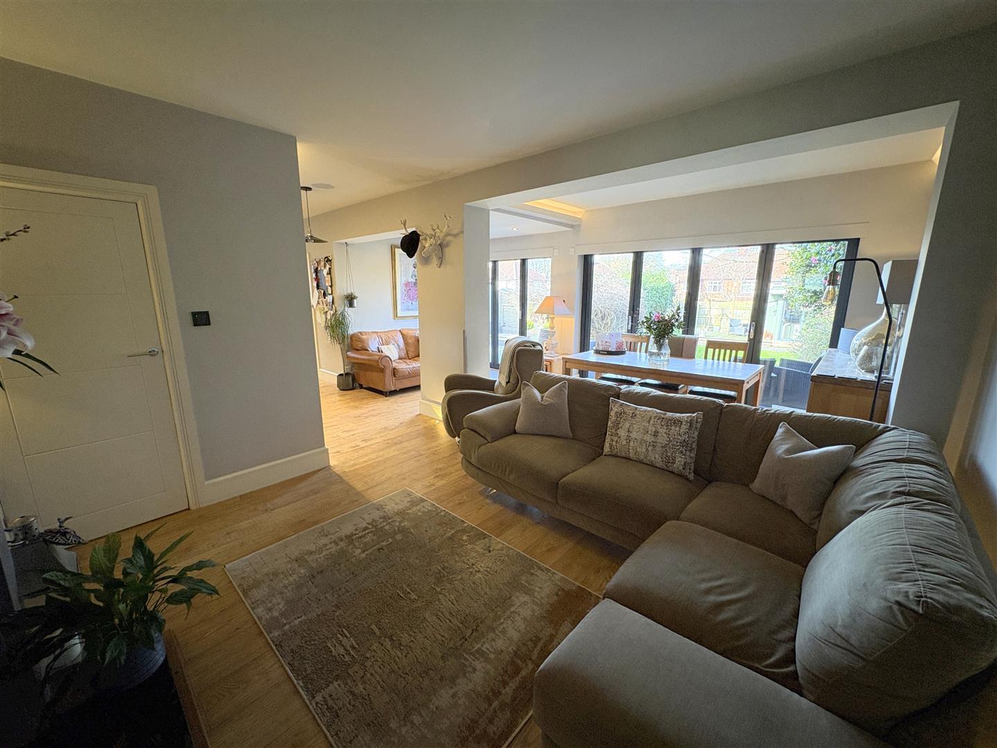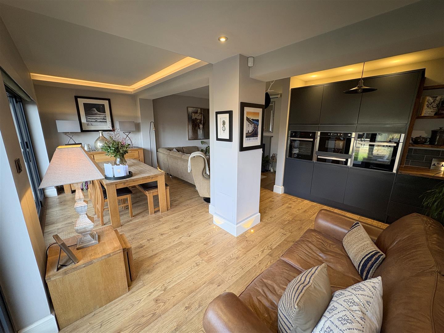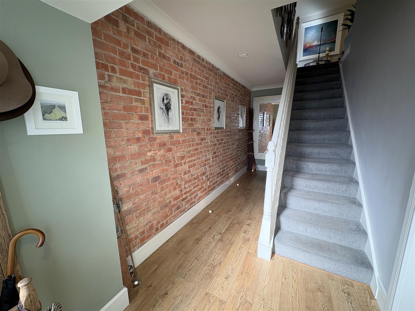 Entering through the stylish front door, the reception hallway immediately creates a strong first impression. An exposed brick feature wall sets the tone for the high-quality décor found throughout the home, while the sense of space is instantly apparent. A staircase leads to the first floor, and there is a useful under stairs storage cupboard. The space is finished with durable LVT flooring and enhanced by recessed LED floor lighting, highlighting the warm tones of the brickwork. The hallway provides access to the lounge and continues through to the rear open-plan kitchen/dining area.