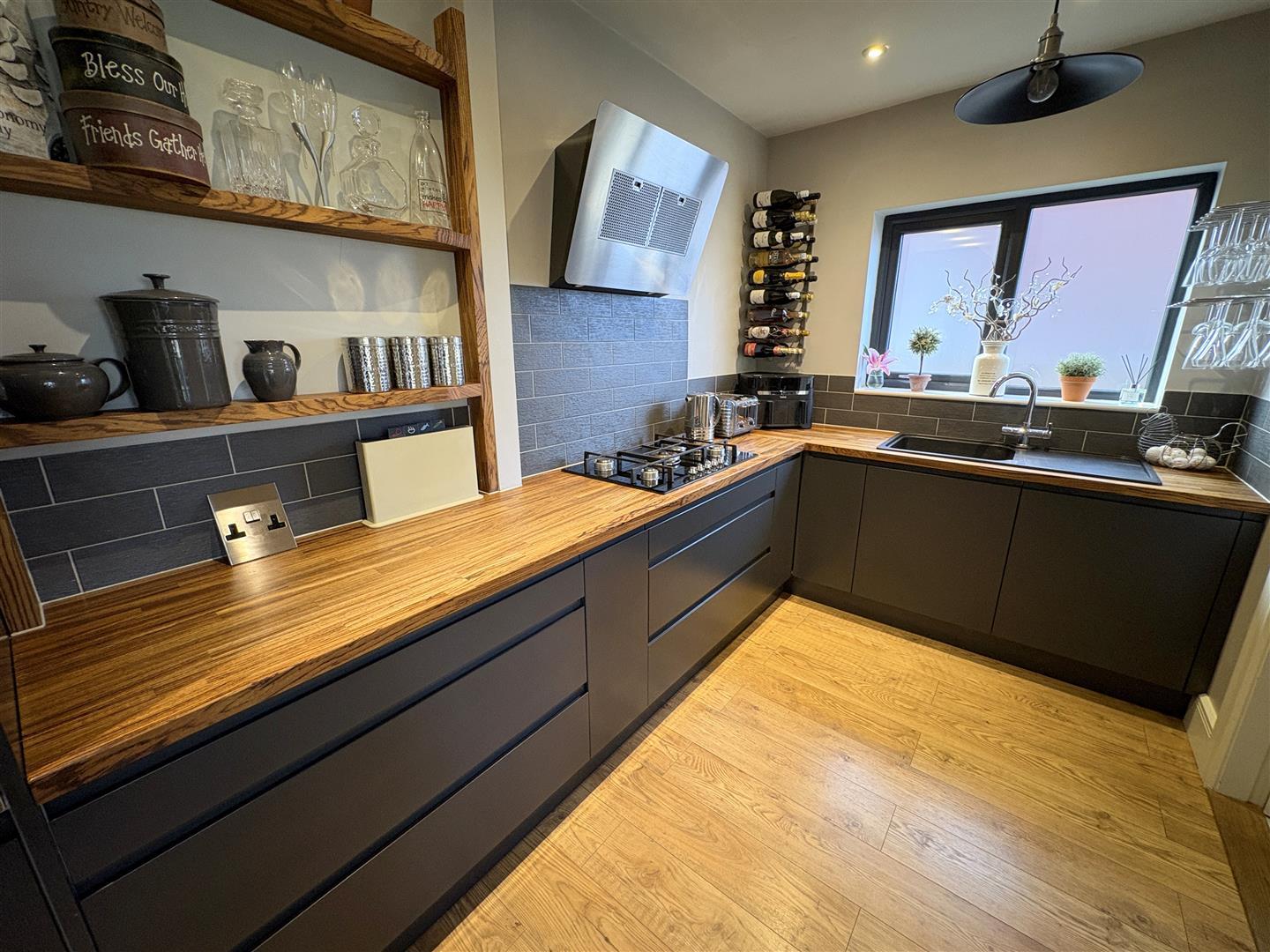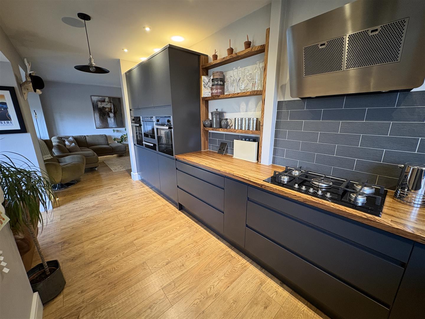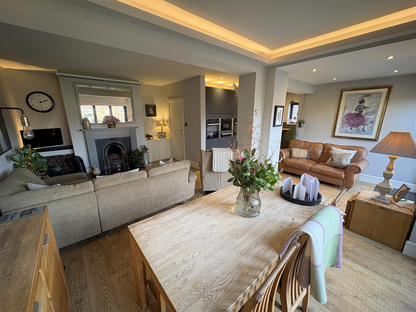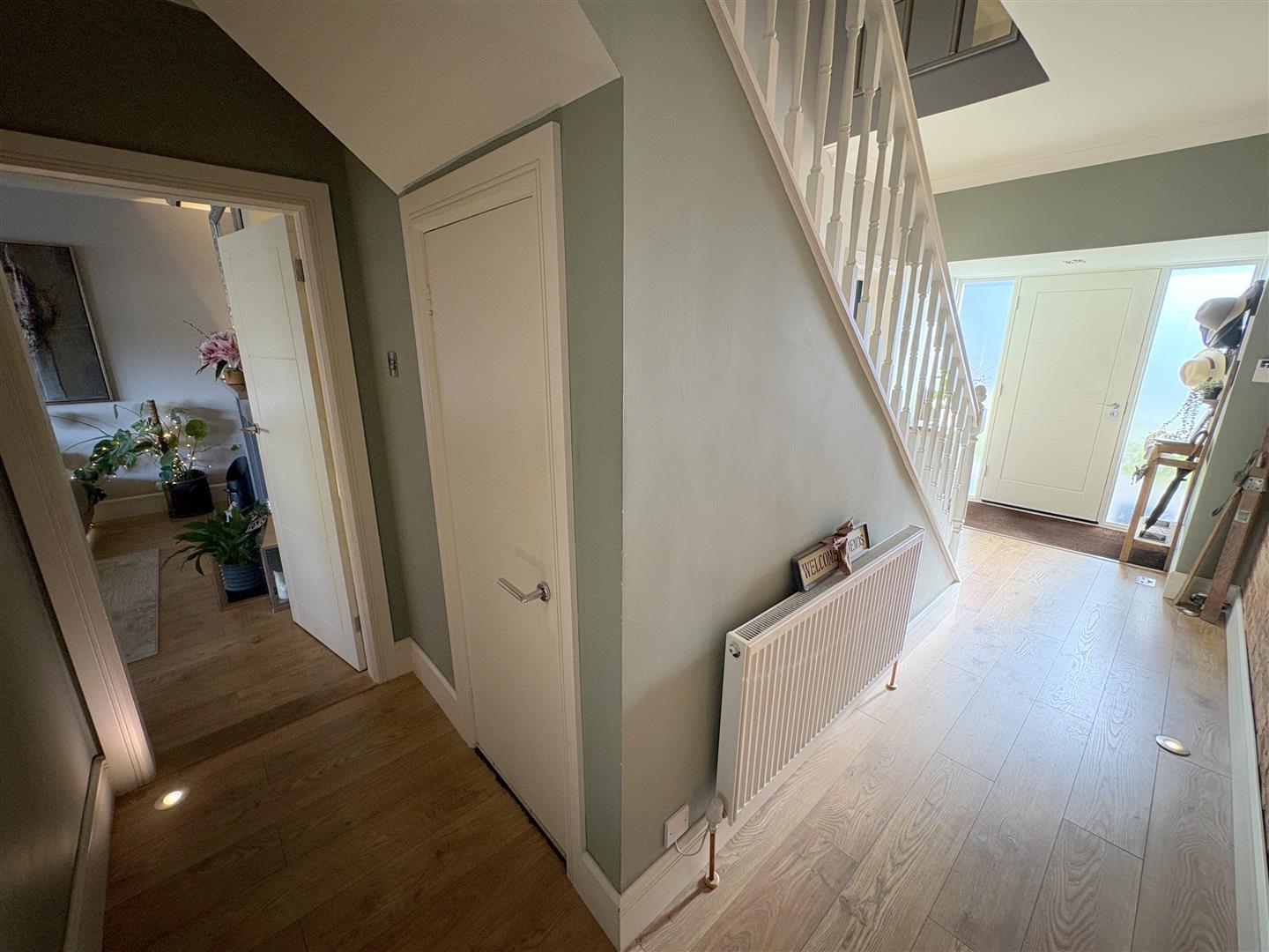 Entering through the stylish front door, the reception hallway immediately creates a strong first impression. An exposed brick feature wall sets the tone for the high-quality décor found throughout the home, while the sense of space is instantly apparent. A staircase leads to the first floor, and there is a useful under stairs storage cupboard. The space is finished with durable LVT flooring and enhanced by recessed LED floor lighting, highlighting the warm tones of the brickwork. The hallway provides access to the lounge and continues through to the rear open-plan kitchen/dining area.