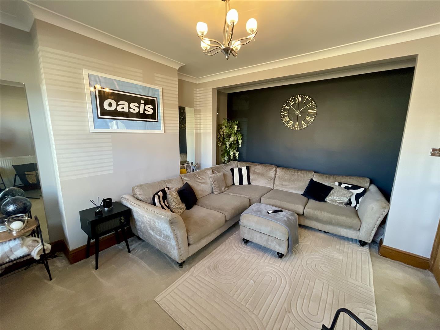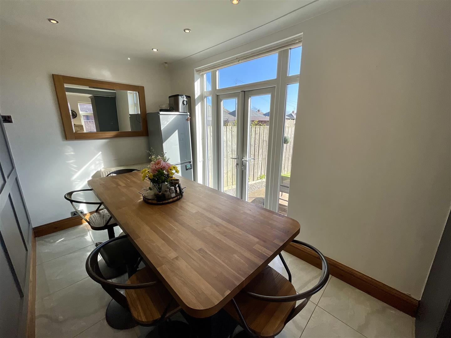 Open aspect from kitchen area, with Upvc double glazed French doors to rear, panelling to feature wall and space for a dining table and chairs. Coving and spotlights to ceiling and tiled floor.