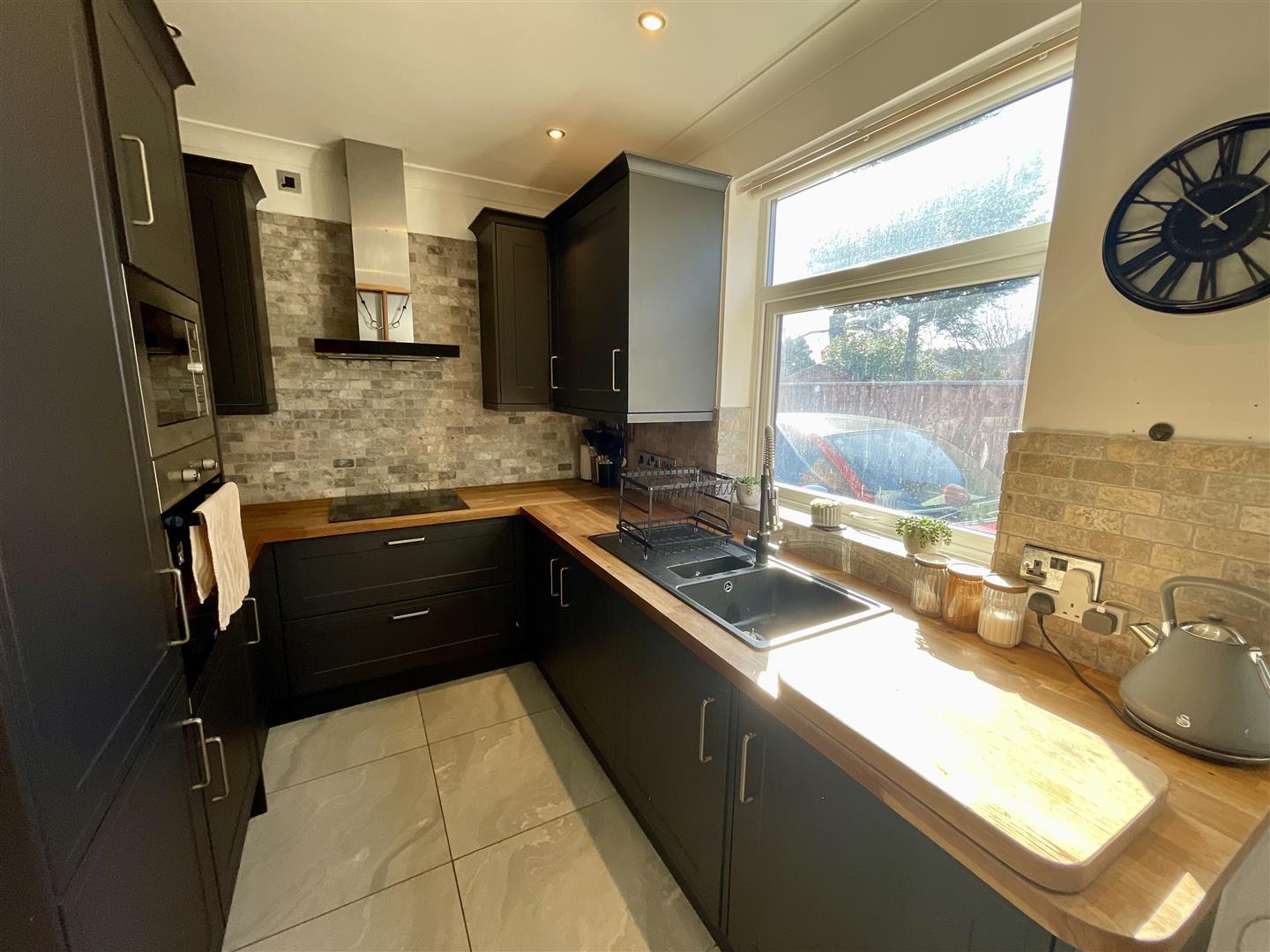 An L shaped open aspect room with Upvc double glazed window to side, fitted wall, base and drawer units, integrated electric hob with extractor over and eye level oven and integrated microwave. Composite sink unit with mixer tap and spray, integrated washing machine, fridge and freezer. Coving and spotlights to ceiling with tiled floor.