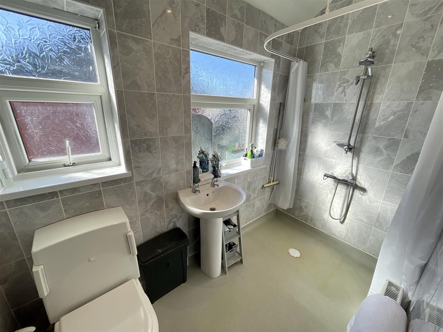 Two Upvc double glazed obscure windows to side, wet room floor with shower, wash hand basin, w.c, tiled walls and radiator.