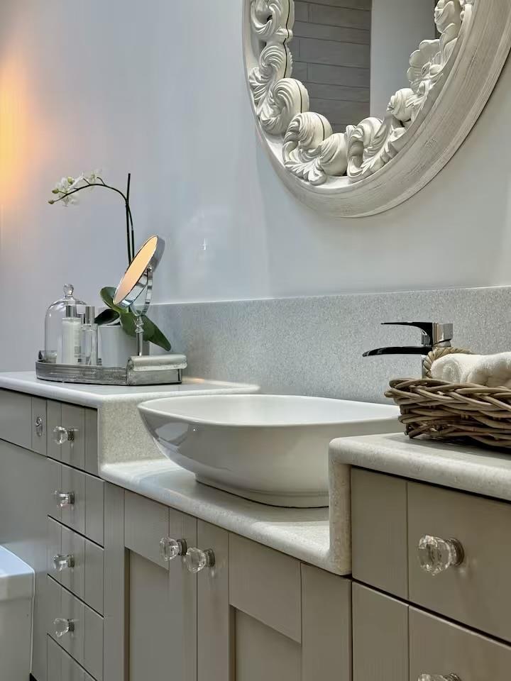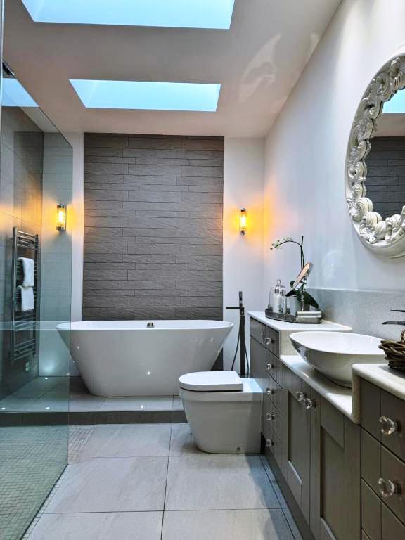 Luxurious ensuite bathroom comprising of a freestanding bath, walk-in shower, hand wash basin and WC inset to a vanity unit.