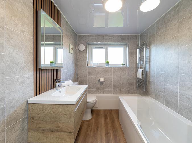 Recently fitted modern bathroom comprising of a bath, hand wash basin set to a vanity unit, WC, heated towel rail, extractor fan and UPVC double glazed opaque window to the rear.