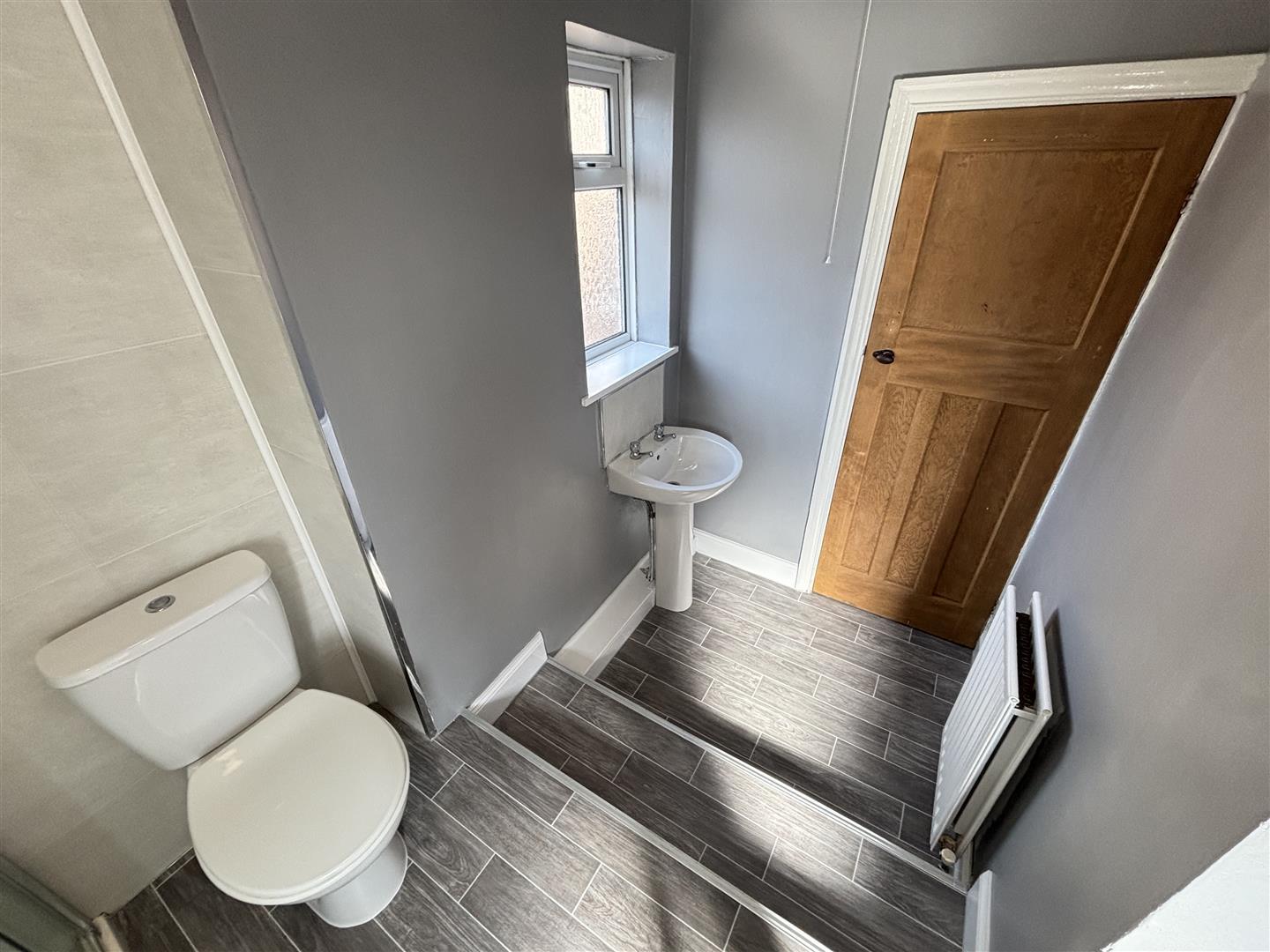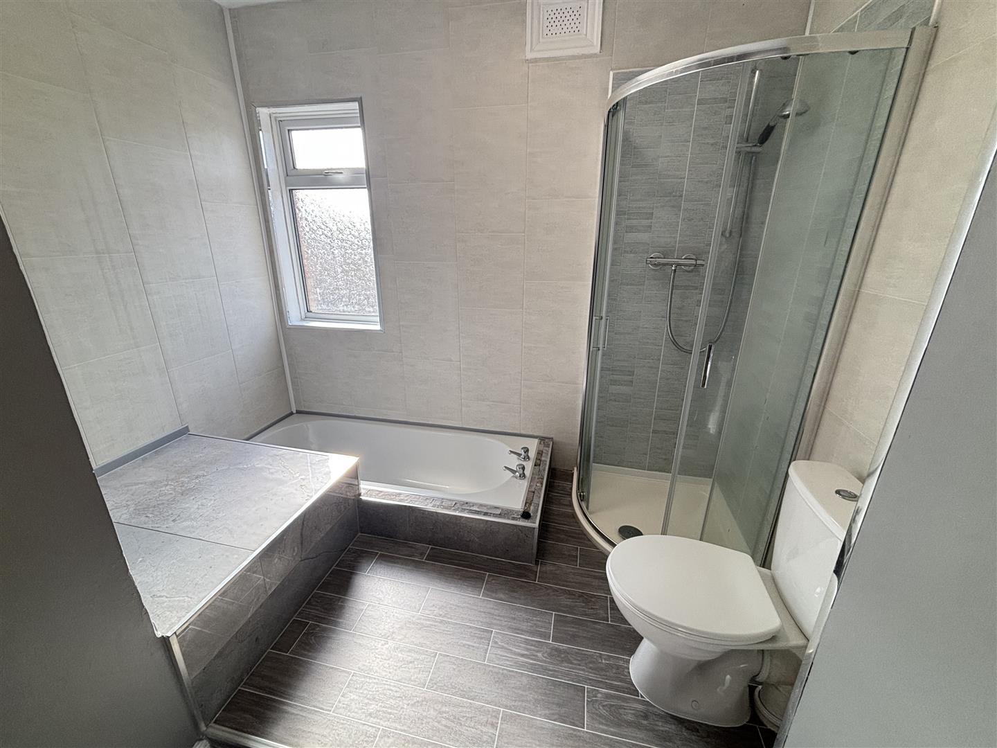 Modern refitted bathroom comprising of a panelled bath, cubicle with mains shower, pedestal wash basin and WC. Having a radiator and UPVC double glazed opaque windows to the rear and side.
