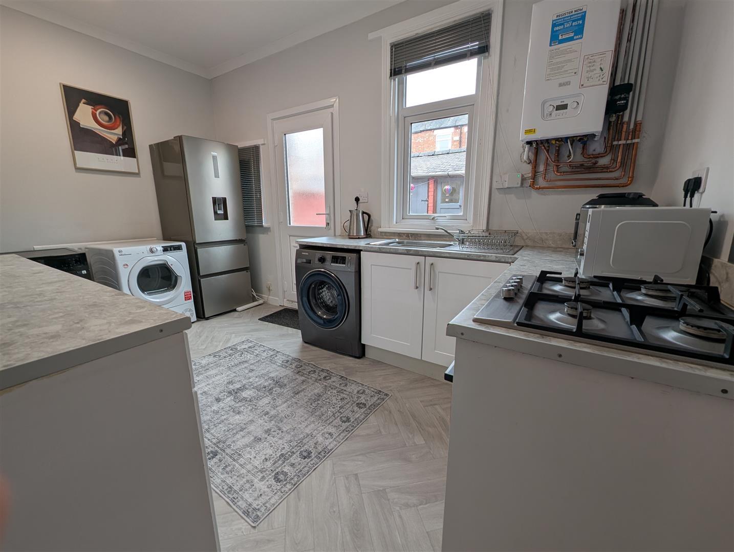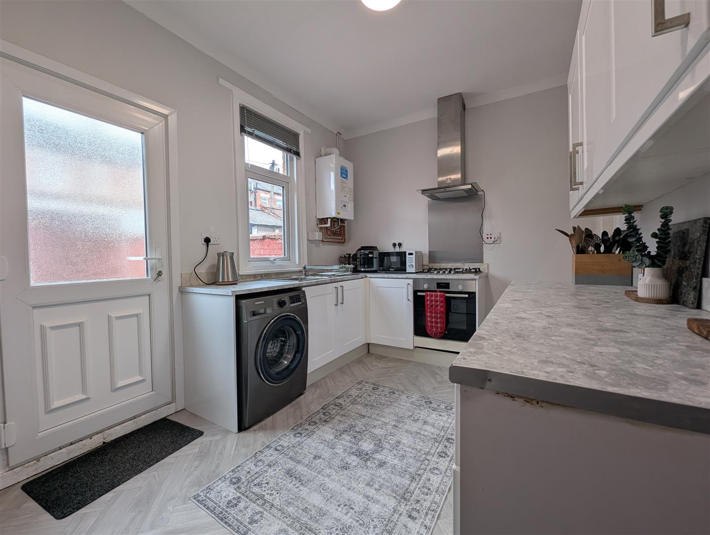 Upvc double glazed window and door to rear, fitted with wall, base and drawer units, stainless steel sink with mixer tap. Four ring gas hob with two ovens. Space for a fridge freezer, washing machine and tumble dryer. Under stairs storage, wall mounted boiler and vinyl flooring.