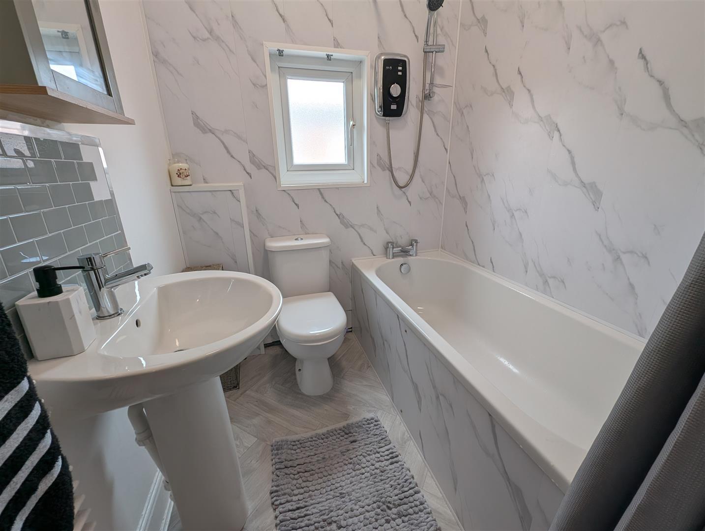 Panelled bath with shower over, low level w.c and wash hand basin. Pvc walls and heated towel rail.