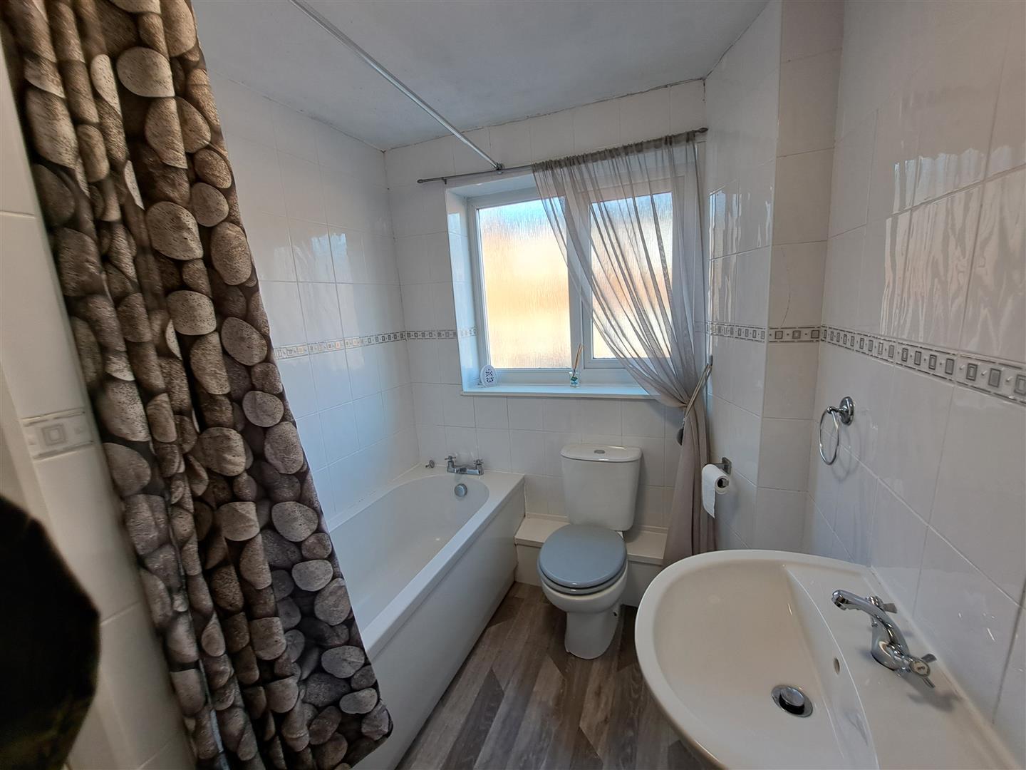 Refitted with white suite comprising of panelled bath with shower over, pedestal wash hand basin, low level wc, heated towel rail, part tiled walls, storage cupboard, UPVC double glazed window.