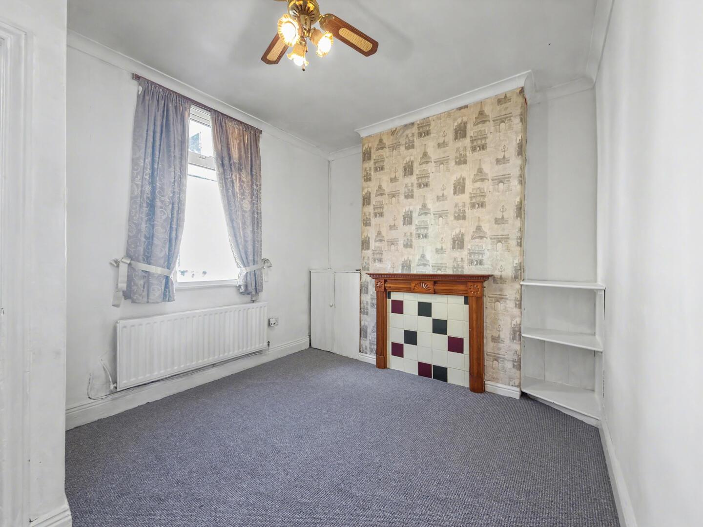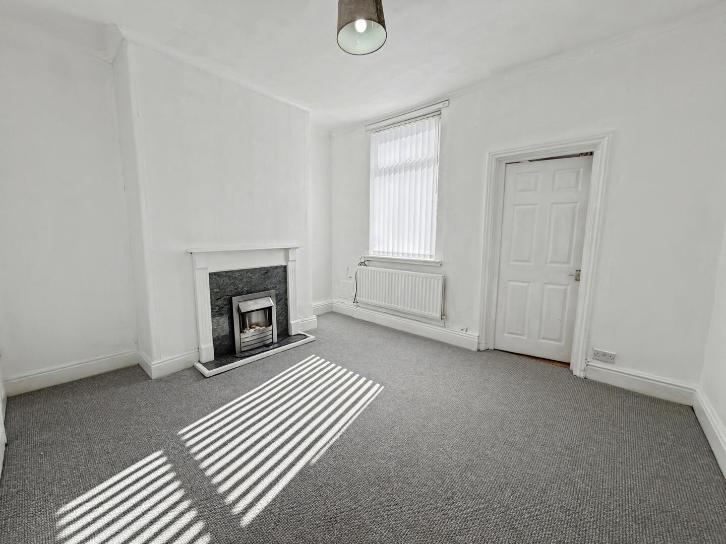 Bedroom 1 is a tranquil space with soft grey carpeting and bright white walls. A ceiling light fan provides practical illumination and air circulation. The room features a large window with vertical blinds, allowing for ample natural light and privacy as needed. A radiator beneath the window offers heating, and the simple decor creates a versatile space ready to personalise.