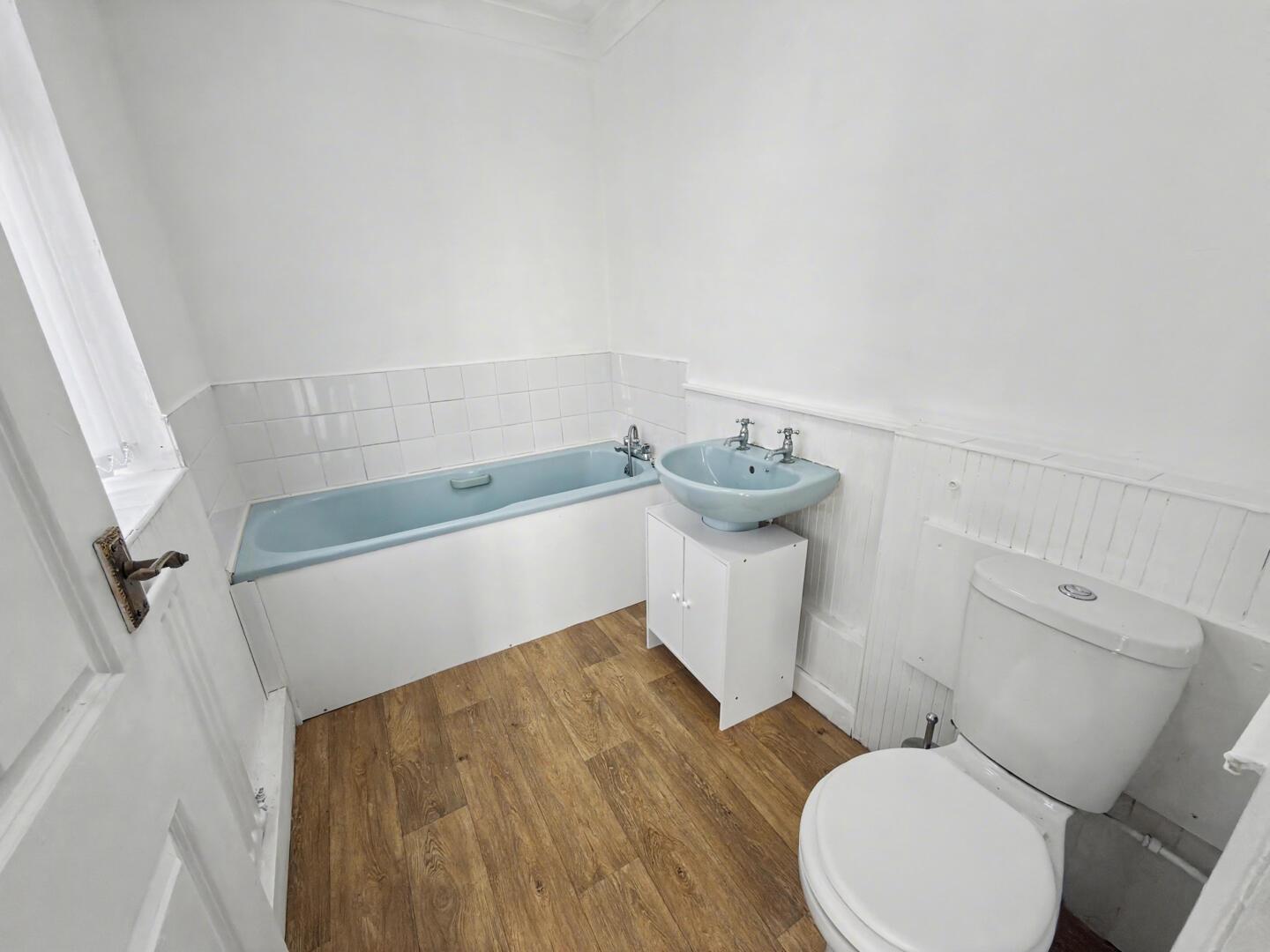 With a sweet comprising panel bath, pedestal wash and basin, law level WC and double glazed window to side elevation.