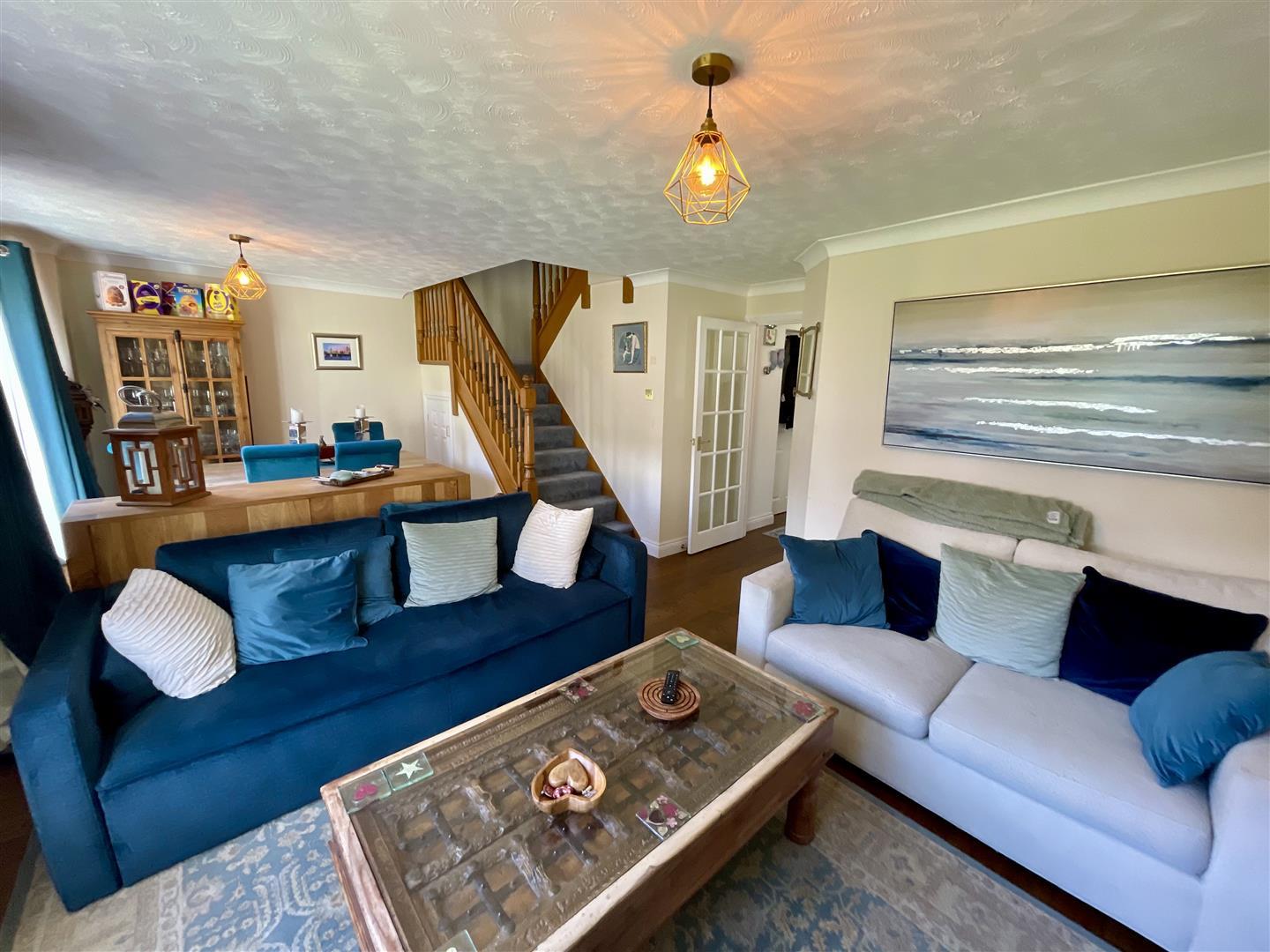 Upvc double glazed window and double doors to rear, fireplace with inset fire, coving to ceiling and staircase to first floor landing. Open aspect to dining area.