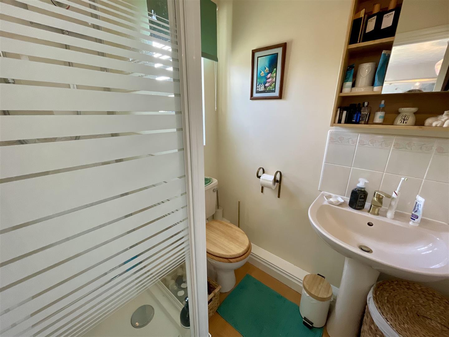 Upvc double glazed obscure window to rear, shower cubicle, w.c, wash hand basin and heated towel rail.
