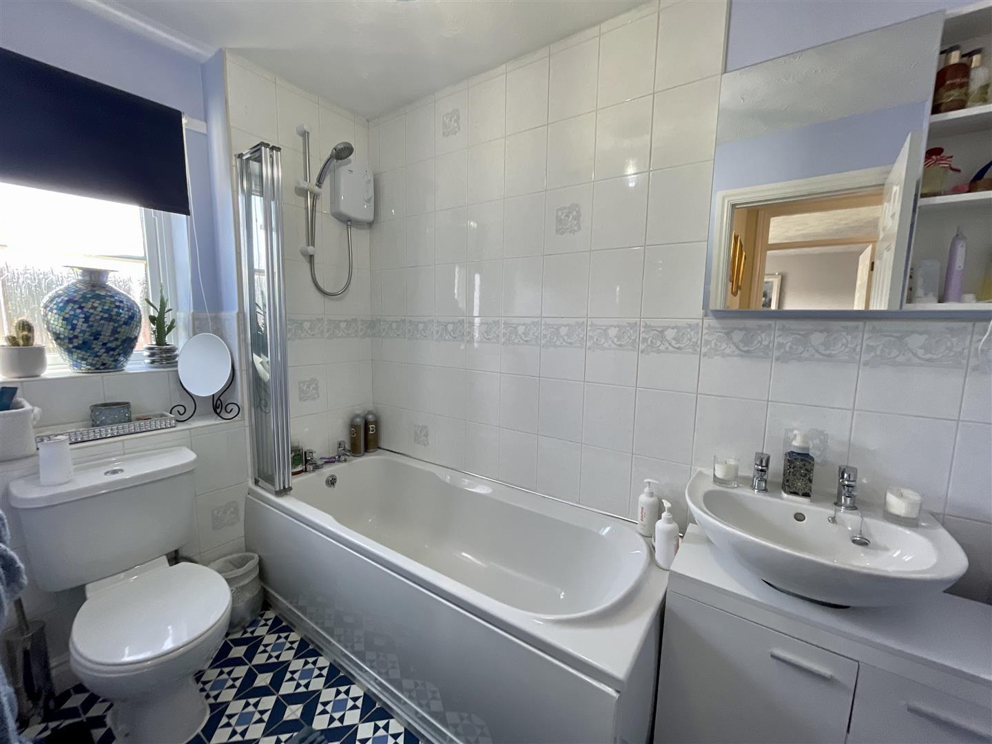 Upvc double glazed obscure window to rear, bath with shower over and screen, w.c, wash hand basin and heated towel rail. Part tiled walls.