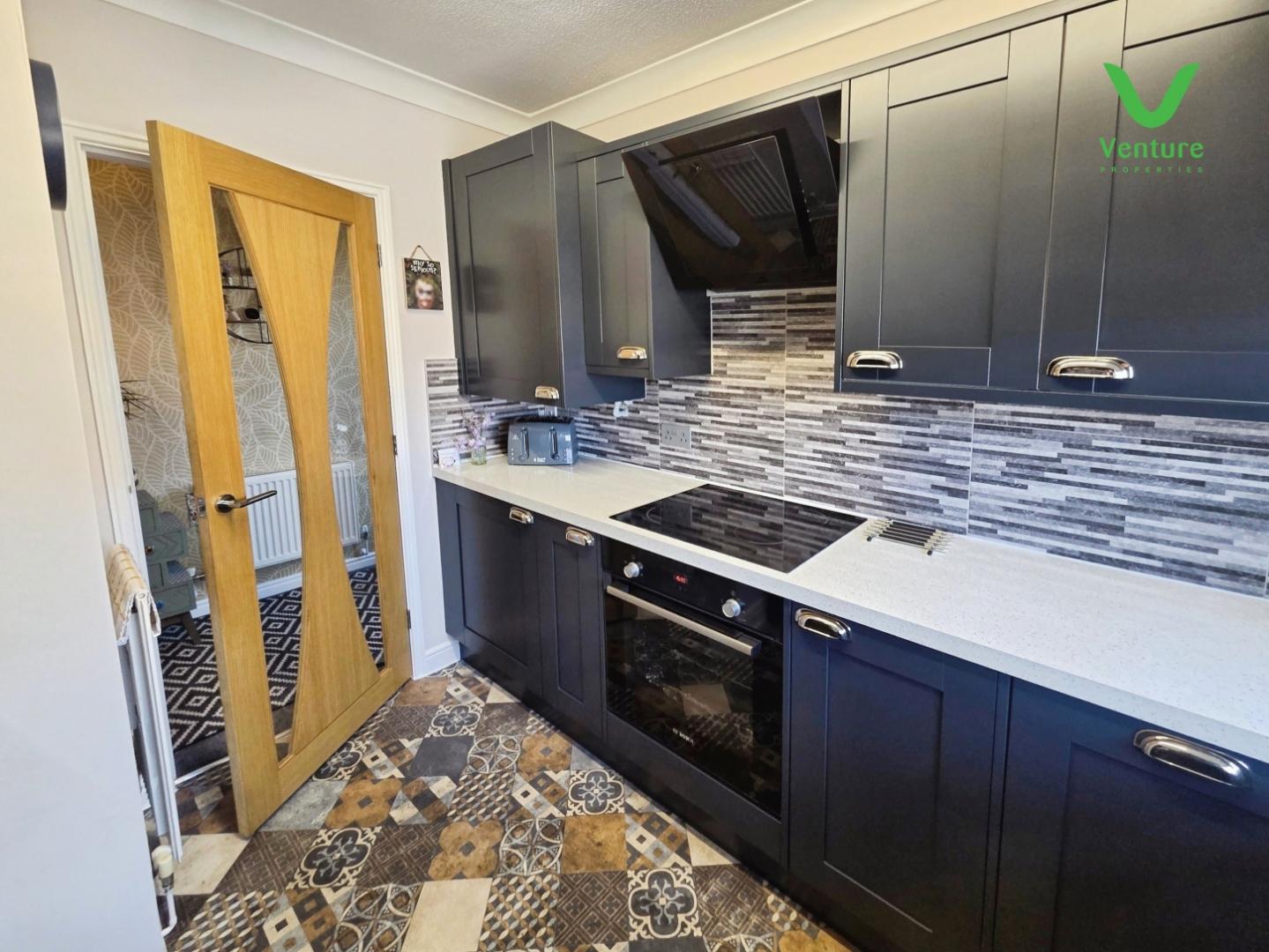 Fitted with an excellent range of wall and base units having contrasting working surfaces over, integrated appliances to include eclectic oven and touch hob over with extraction chimney over, dishwasher, plumbing for washing machine, space for fridge freezer sink unit with mixer tap over, tiled splash backs, central heating radiator and upvc double glazed window to rear.